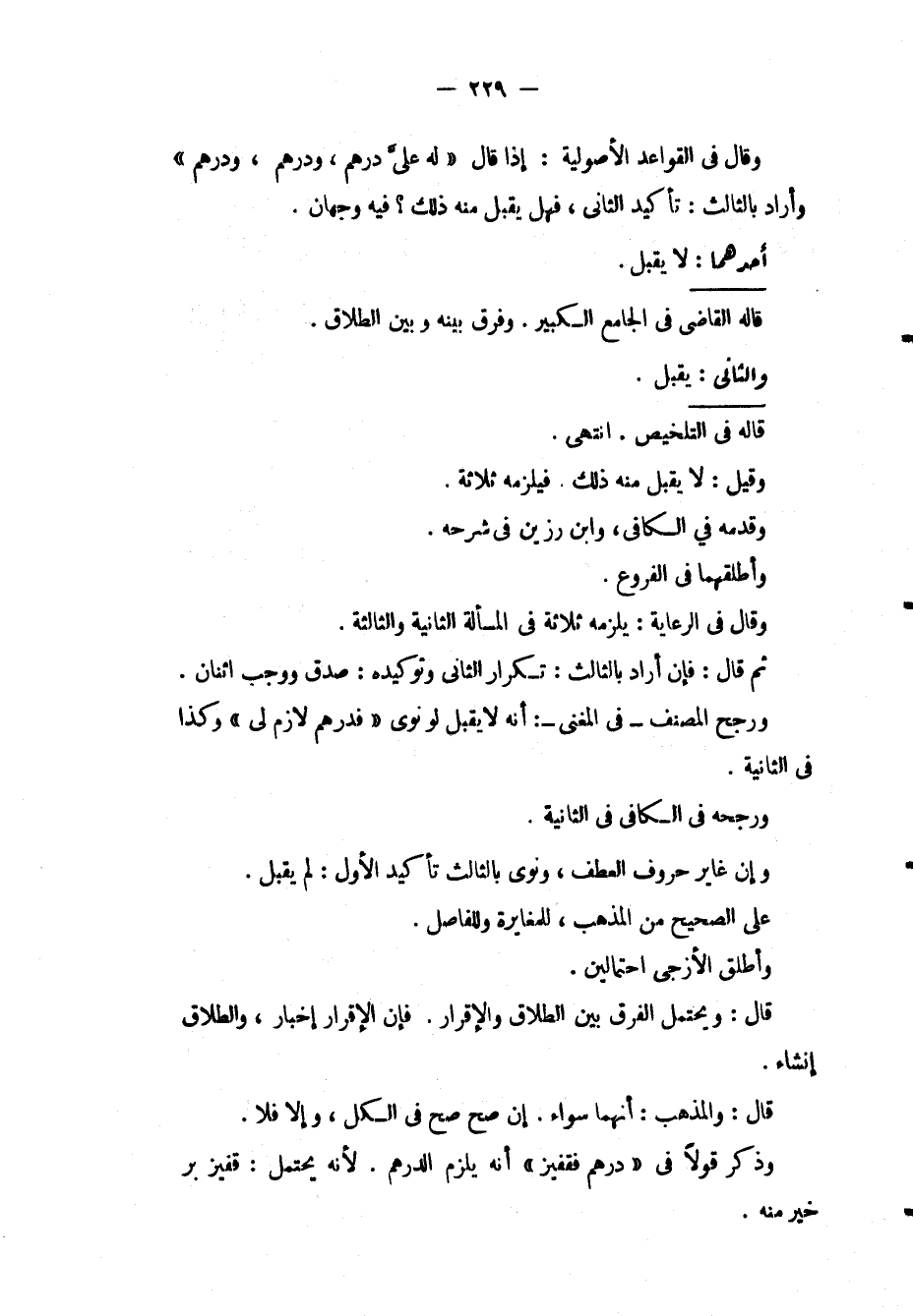 وَقَالَ فِي الْقَوَاعِدِ الْأُصُولِيَّةِ: إذَا قَالَ " لَهُ عَلَيَّ دِرْهَمٌ، وَدِرْهَمٌ، وَدِرْهَمٌ " وَأَرَادَ بِالثَّالِثِ: تَأْكِيدَ الثَّانِي، فَهَلْ يُقْبَلُ مِنْهُ ذَلِكَ؟ فِيهِ وَجْهَانِ أَحَدُهُمَا: لَا يُقْبَلُ قَالَهُ الْقَاضِي فِي الْجَامِعِ الْكَبِيرِ وَفَرَّقَ بَيْنَهُ وَبَيْنَ الطَّلَاقِ، وَالثَّانِي: يُقْبَلُ قَالَهُ فِي التَّلْخِيصِ انْتَهَى وَقِيلَ لَا يُقْبَلُ مِنْهُ ذَلِكَ فَيَلْزَمُهُ ثَلَاثَةٌ وَقَدَّمَهُ فِي الْكَافِي، وَابْنِ رَزِينٍ فِي شَرْحِهِ وَأَطْلَقَهُمَا فِي الْفُرُوعِ وَقَالَ فِي الرِّعَايَةِ: يَلْزَمُهُ ثَلَاثَةٌ فِي الْمَسْأَلَةِ الثَّانِيَةِ وَالثَّالِثَةِ ثُمَّ قَالَ: فَإِنْ أَرَادَ بِالثَّالِثِ: تَكْرَارَ الثَّانِي وَتَوْكِيدَهُ: صُدِّقَ وَوَجَبَ اثْنَانِ وَرَجَّحَ الْمُصَنِّفُ فِي الْمُغْنِي: أَنَّهُ لَا يُقْبَلُ لَوْ نَوَى " فَدِرْهَمٌ لَازِمٌ لِي " وَكَذَا فِي الثَّانِيَةِ وَرَجَّحَهُ فِي الْكَافِي فِي الثَّانِيَةِ وَإِنْ غَايَرَ حُرُوفَ الْعَطْفِ، وَنَوَى بِالثَّالِثِ تَأْكِيدَ الْأَوَّلِ: لَمْ يُقْبَلْ عَلَى الصَّحِيحِ مِنْ الْمَذْهَبِ، لِلْمُغَايَرَةِ وَلِلْفَاصِلِ وَأَطْلَقَ الْأَزَجِيُّ احْتِمَالَيْنِ قَالَ: وَيَحْتَمِلُ الْفَرْقَ بَيْنَ الطَّلَاقِ وَالْإِقْرَارِ فَإِنَّ الْإِقْرَارَ إخْبَارٌ، وَالطَّلَاقُ إنْشَاءٌ قَالَ: وَالْمَذْهَبُ: أَنَّهُمَا سَوَاءٌ إنْ صَحَّ صَحَّ فِي الْكُلِّ، وَإِلَّا فَلَا وَذَكَرَ قَوْلًا فِي " دِرْهَمٌ فَقَفِيزٌ " أَنَّهُ يَلْزَمُ الدِّرْهَمُ لِأَنَّهُ يَحْتَمِلُ: قَفِيزَ بُرٍّ خَيْرٌ مِنْهُ
