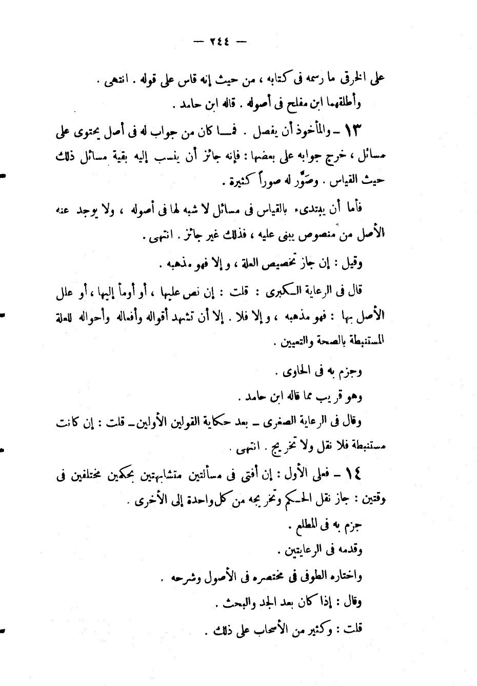 13 - وَالْمَأْخُوذُ أَنْ يُفَصَّلَ فَمَا كَانَ مِنْ جَوَابٍ لَهُ فِي أَصْلٍ يَحْتَوِي عَلَى مَسَائِلَ، خَرَجَ جَوَابُهُ عَلَى بَعْضِهَا: فَإِنَّهُ جَائِزٌ أَنْ يُنْسَبَ إلَيْهِ بَقِيَّةُ مَسَائِلِ ذَلِكَ حَيْثُ الْقِيَاسُ وَصَوَّرَ لَهُ صُوَرًا كَثِيرَةً فَأَمَّا أَنْ يَبْتَدِئَ بِالْقِيَاسِ فِي مَسَائِلَ لَا شَبَهَ لَهَا فِي أُصُولِهِ، وَلَا يُوجَدُ عَنْهُ الْأَصْلُ مِنْ مَنْصُوصٍ يَبْنِي عَلَيْهِ، فَذَلِكَ غَيْرُ جَائِزٍ انْتَهَى وَقِيلَ: إنْ جَازَ تَخْصِيصُ الْعِلَّةِ، وَإِلَّا فَهُوَ مَذْهَبُهُ قَالَ فِي الرِّعَايَةِ الْكُبْرَى: قُلْت: إنْ نَصَّ عَلَيْهَا، أَوْ أَوْمَأَ إلَيْهَا، أَوْ عَلَّلَ الْأَصْلَ بِهَا: فَهُوَ مَذْهَبُهُ، وَإِلَّا فَلَا إلَّا أَنْ تَشْهَدَ أَقْوَالُهُ وَأَفْعَالُهُ وَأَحْوَالُهُ لِلْعِلَّةِ الْمُسْتَنْبَطَةِ بِالصِّحَّةِ وَالتَّعْيِينِ وَجَزَمَ بِهِ فِي الْحَاوِي وَهُوَ قَرِيبٌ مِمَّا قَالَهُ ابْنُ حَامِدٍ وَقَالَ فِي الرِّعَايَةِ الصُّغْرَى بَعْدَ حِكَايَةِ الْقَوْلَيْنِ الْأَوَّلَيْنِ قُلْت: إنْ كَانَتْ مُسْتَنْبَطَةً فَلَا نَقْلَ وَلَا تَخْرِيجَ انْتَهَى