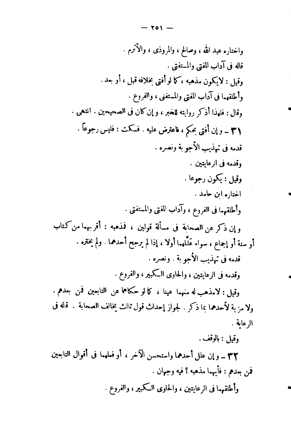 31 - وَإِنْ أَفْتَى بِحُكْمٍ، فَاعْتُرِضَ عَلَيْهِ فَسَكَتَ: فَلَيْسَ رُجُوعًا قَدَّمَهُ فِي تَهْذِيبِ الْأَجْوِبَةِ وَنَصَرَهُ وَقَدَّمَهُ فِي الرِّعَايَتَيْنِ وَقِيلَ: يَكُونُ رُجُوعًا اخْتَارَهُ ابْنُ حَامِدٍ وَأَطْلَقَهُمَا فِي الْفُرُوعِ، وَآدَابِ الْمُفْتِي وَالْمُسْتَفْتِي وَإِنْ ذَكَرَ عَنْ الصَّحَابَةِ فِي مَسْأَلَةٍ قَوْلَيْنِ، فَمَذْهَبُهُ: أَقْرَبُهُمَا مِنْ كِتَابٍ أَوْ سُنَّةٍ أَوْ إجْمَاعٍ، سَوَاءٌ عَلَّلَهُمَا أَوْ لَا، إذَا لَمْ يُرَجِّحْ أَحَدَهُمَا وَلَمْ يَخْتَرْهُ قَدَّمَهُ فِي تَهْذِيبِ الْأَجْوِبَةِ وَنَصَرَهُ وَقَدَّمَهُ فِي الرِّعَايَتَيْنِ، وَالْحَاوِي الْكَبِيرِ، وَالْفُرُوعِ وَقِيلَ: لَا مَذْهَبَ لَهُ مِنْهُمَا عَيْنًا، كَمَا لَوْ حَكَاهُمَا عَنْ التَّابِعِينَ فَمَنْ بَعْدَهُمْ وَلَا مَزِيَّةَ لِأَحَدِهِمَا بِمَا ذَكَرَ لِجَوَازِ إحْدَاثِ قَوْلٍ ثَالِثٍ يُخَالِفُ الصَّحَابَةَ قَالَهُ فِي الرِّعَايَةِ وَقِيلَ: بِالْوَقْفِ.