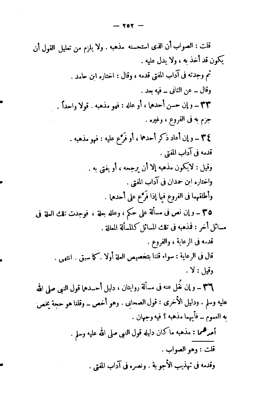 34 - وَإِنْ أَعَادَ ذِكْرَ أَحَدَهُمَا، أَوْ فَرَّعَ عَلَيْهِ: فَهُوَ مَذْهَبُهُ قَدَّمَهُ فِي آدَابِ الْمُفْتِي وَقِيلَ: لَا يَكُونُ مَذْهَبَهُ إلَّا أَنْ يُرَجِّحَهُ، أَوْ يُفْتِيَ بِهِ وَاخْتَارَهُ ابْنُ حَمْدَانَ فِي آدَابِ الْمُفْتِي وَأَطْلَقَهُمَا فِي الْفُرُوعِ فِيمَا إذَا فَرَّعَ عَلَى أَحَدِهِمَا