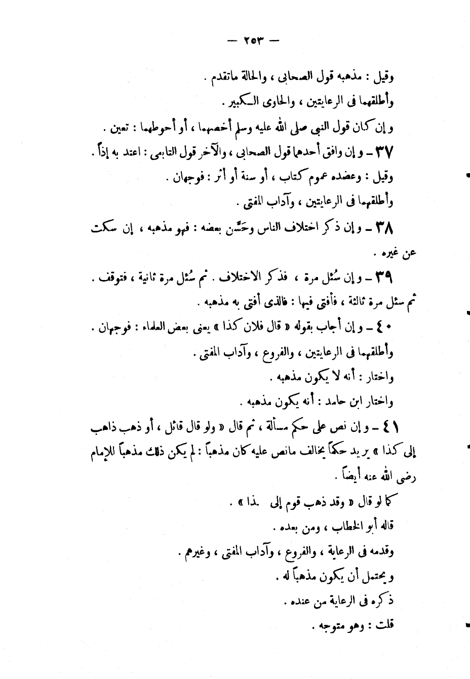 41 - وَإِنْ نَصَّ عَلَى حُكْمِ مَسْأَلَةٍ، ثُمَّ قَالَ " وَلَوْ قَالَ قَائِلٌ، أَوْ ذَهَبَ ذَاهِبٌ إلَى كَذَا " يُرِيدُ حُكْمًا يُخَالِفُ مَا نَصَّ عَلَيْهِ كَانَ مَذْهَبًا: لَمْ يَكُنْ ذَلِكَ مَذْهَبًا لِلْإِمَامِ - رَضِيَ اللَّهُ عَنْهُ - أَيْضًا، كَمَا لَوْ قَالَ " وَقَدْ ذَهَبَ قَوْمٌ إلَى كَذَا "، قَالَهُ أَبُو الْخَطَّابِ، وَمَنْ بَعْدَهُ، وَقَدَّمَهُ فِي الرِّعَايَةِ، وَالْفُرُوعِ، وَآدَابِ الْمُفْتِي، وَغَيْرِهِمْ، وَيَحْتَمِلُ أَنْ يَكُونَ مَذْهَبًا لَهُ، ذَكَرَهُ فِي الرِّعَايَةِ مِنْ عِنْدِهِ، قُلْت: وَهُوَ مُتَوَجِّهٌ.