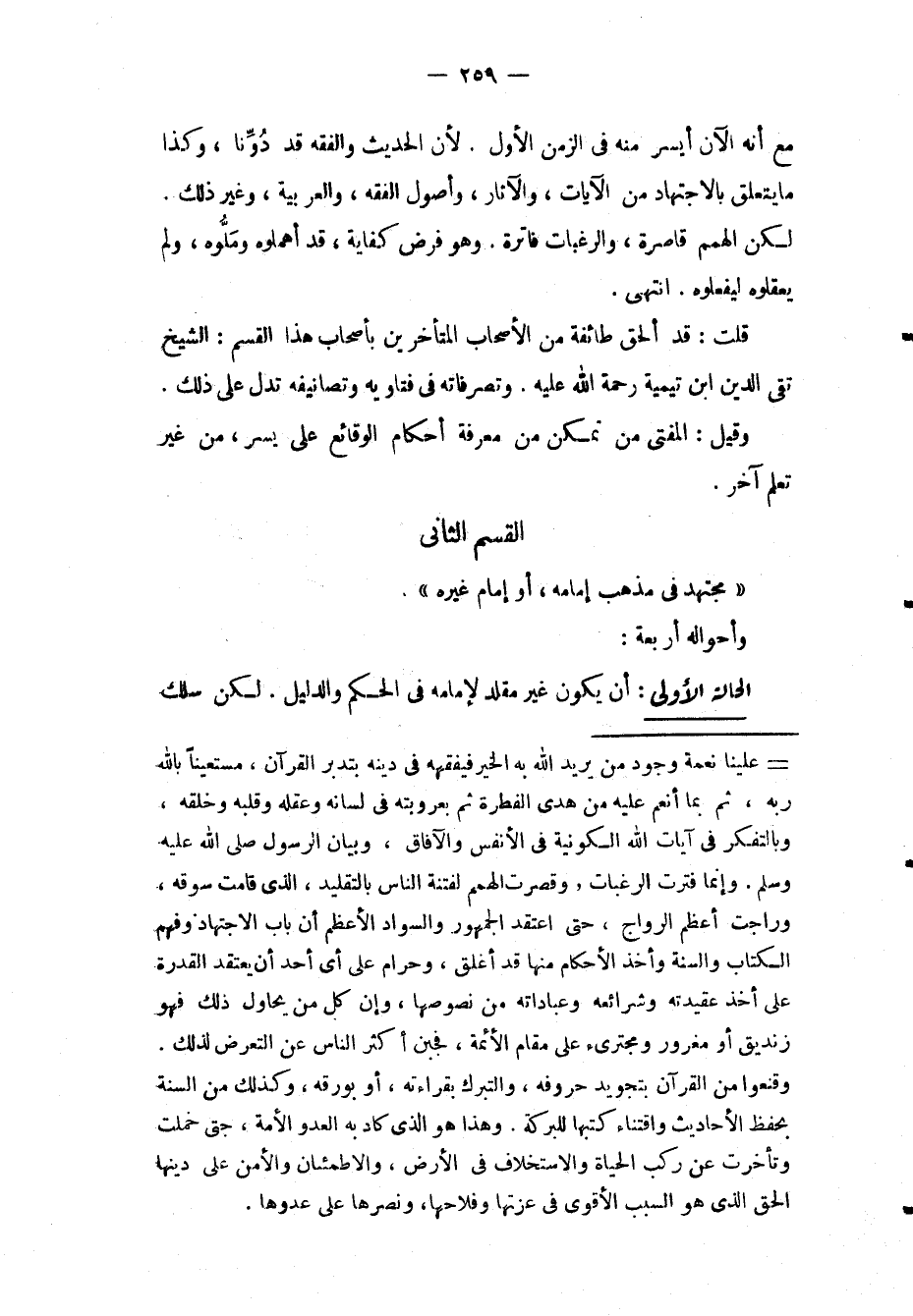 قُلْت: قَدْ أَلْحَقَ طَائِفَةٌ مِنْ الْأَصْحَابِ الْمُتَأَخِّرِينَ بِأَصْحَابِ هَذَا الْقِسْمِ: الشَّيْخَ تَقِيَّ الدِّينِ ابْنَ تَيْمِيَّةَ رَحْمَةُ اللَّهِ عَلَيْهِ، وَتَصَرُّفَاتُهُ فِي فَتَاوِيهِ وَتَصَانِيفِهِ تَدُلُّ عَلَى ذَلِكَ، وَقِيلَ: الْمُفْتِي مَنْ تَمَكَّنَ مِنْ مَعْرِفَةِ أَحْكَامِ الْوَقَائِعِ عَلَى يُسْرٍ، مِنْ غَيْرِ تَعَلُّمٍ آخَرَ.