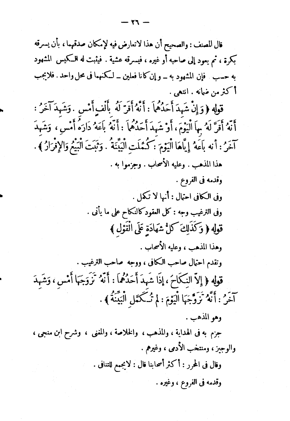 قَوْلُهُ (وَكَذَلِكَ كُلُّ شَهَادَةٍ عَلَى الْقَوْلِ) وَهَذَا الْمَذْهَبُ، وَعَلَيْهِ الْأَصْحَابُ، وَتَقَدَّمَ احْتِمَالُ صَاحِبِ الْكَافِي، وَوَجْهُ صَاحِبِ التَّرْغِيبِ. قَوْلُهُ (إلَّا النِّكَاحَ، إذَا شَهِدَ أَحَدُهُمَا: أَنَّهُ تَزَوَّجَهَا أَمْسِ، وَشَهِدَ آخَرُ: أَنَّهُ تَزَوَّجَهَا الْيَوْمَ: لَمْ تُكَمَّلْ الْبَيِّنَةُ) وَهُوَ الْمَذْهَبُ، جَزَمَ بِهِ فِي الْهِدَايَةِ، وَالْمُذْهَبِ، وَالْخُلَاصَةِ، وَالْمُغْنِي، وَشَرْحِ ابْنِ مُنَجَّا، وَالْوَجِيزِ، وَمُنْتَخَبِ الْأَدَمِيِّ، وَغَيْرِهِمْ، وَقَالَ فِي الْمُحَرَّرِ: أَكْثَرُ أَصْحَابِنَا قَالَ: لَا يَجْمَعُ لِلتَّنَافِي، وَقَدَّمَهُ فِي الْفُرُوعِ، وَغَيْرِهِ،
