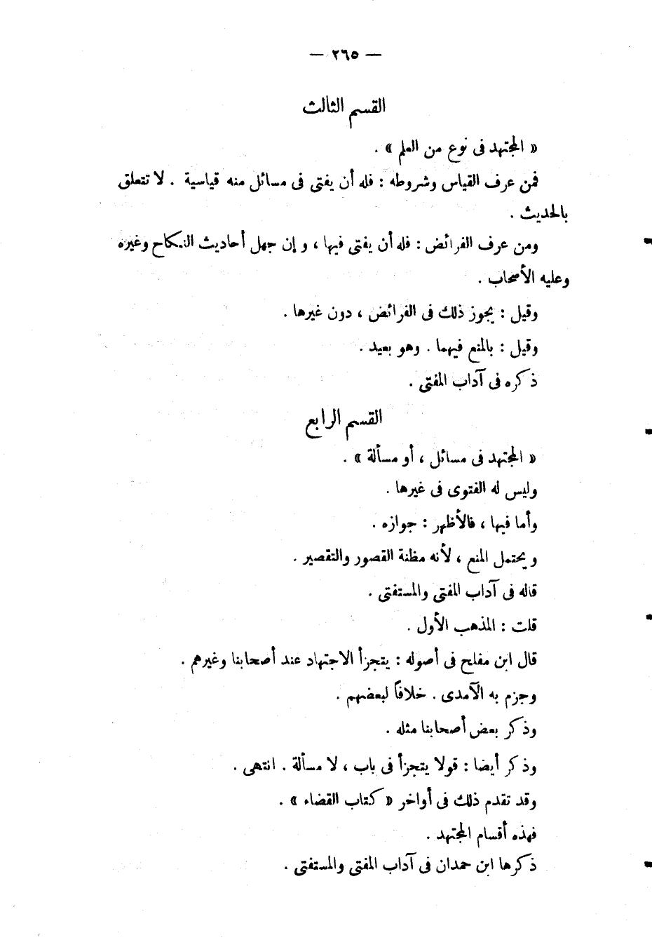 " الْمُجْتَهِدُ فِي مَسَائِلَ، أَوْ مَسْأَلَةٍ "، وَلَيْسَ لَهُ الْفَتْوَى فِي غَيْرِهَا، وَأَمَّا فِيهَا، فَالْأَظْهَرُ: جَوَازُهُ، وَيَحْتَمِلُ الْمَنْعَ؛ لِأَنَّهُ مَظِنَّةُ الْقُصُورِ وَالتَّقْصِيرِ، قَالَهُ فِي آدَابِ الْمُفْتِي وَالْمُسْتَفْتِي، قُلْت: الْمَذْهَبُ الْأَوَّلُ، قَالَ ابْنُ مُفْلِحٍ فِي أُصُولِهِ: يَتَجَزَّأُ الِاجْتِهَادُ عِنْدَ أَصْحَابِنَا وَغَيْرِهِمْ، وَجَزَمَ بِهِ الْأَمَدِيُّ، خِلَافًا لِبَعْضِهِمْ، وَذَكَرَ بَعْضُ أَصْحَابِنَا مِثْلَهُ، وَذَكَرَ أَيْضًا: قَوْلًا يَتَجَزَّأُ فِي بَابٍ، لَا مَسْأَلَةٍ. انْتَهَى. وَقَدْ تَقَدَّمَ ذَلِكَ فِي أَوَاخِرِ " كِتَابِ الْقَضَاءِ "، فَهَذِهِ أَقْسَامُ الْمُجْتَهِدِ، ذَكَرَهَا ابْنُ حَمْدَانَ فِي آدَابِ الْمُفْتِي وَالْمُسْتَفْتِي
