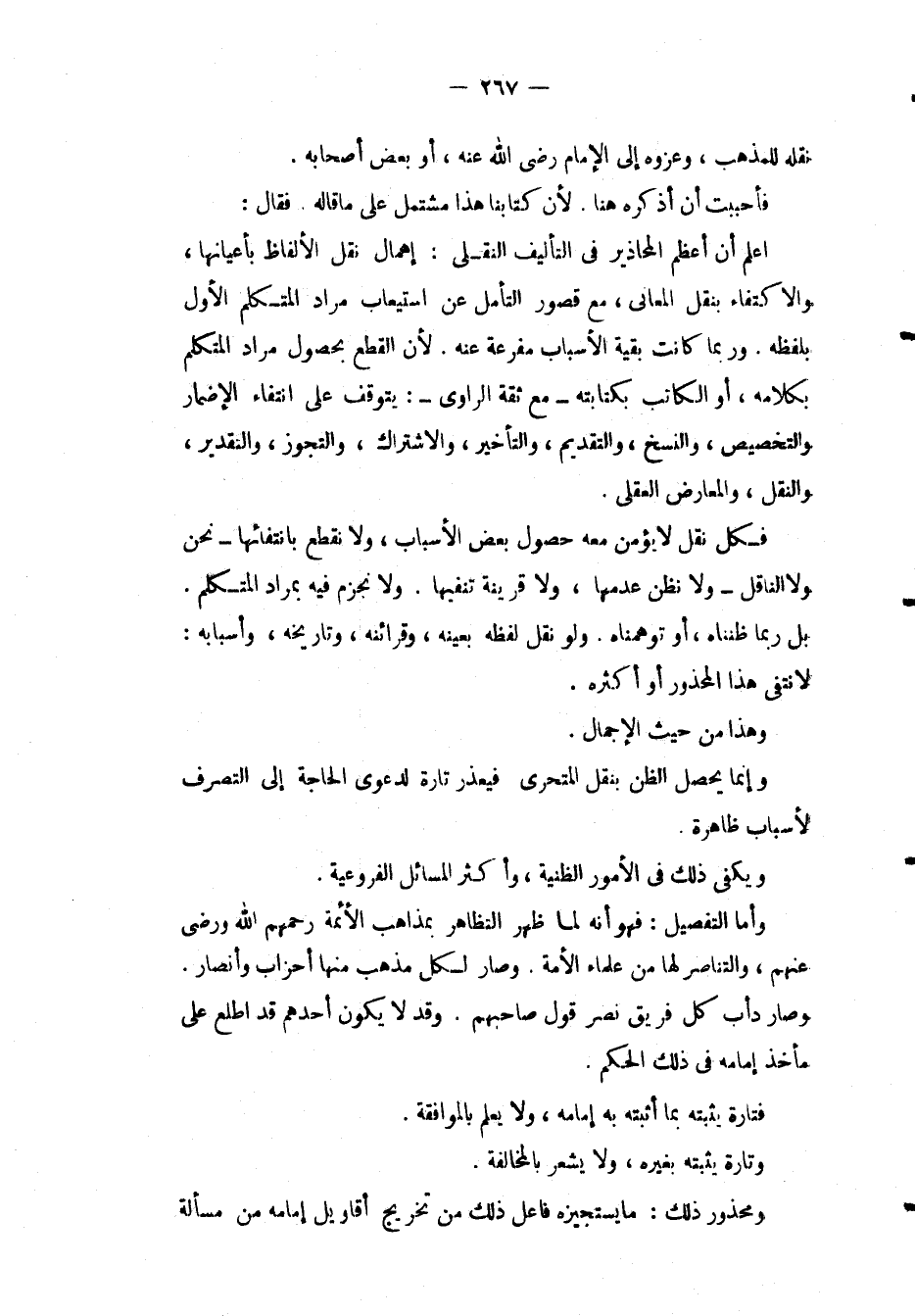 نَقْلُهُ لِلْمَذْهَبِ، وَعَزْوُهُ إلَى الْإِمَامِ - رَضِيَ اللَّهُ عَنْهُ -، أَوْ بَعْضِ أَصْحَابِهِ، فَأَحْبَبْت أَنْ أَذْكُرَهُ هُنَا لِأَنَّ كِتَابَنَا هَذَا مُشْتَمِلٌ عَلَى مَا قَالَهُ، فَقَالَ: اعْلَمْ أَنَّ أَعْظَمَ الْمَحَاذِيرِ فِي التَّأْلِيفِ النَّقْلِيِّ: إهْمَالُ نَقْلِ الْأَلْفَاظِ بِأَعْيَانِهَا، وَالِاكْتِفَاءُ بِنَقْلِ الْمَعَانِي، مَعَ قُصُورِ التَّأَمُّلِ عَنْ اسْتِيعَابِ مُرَادِ الْمُتَكَلِّمِ الْأَوَّلِ بِلَفْظِهِ، وَرُبَّمَا كَانَتْ بَقِيَّةُ الْأَسْبَابِ مُفَرَّعَةً عَنْهُ؛ لِأَنَّ الْقَطْعَ بِحُصُولِ مُرَادِ الْمُتَكَلِّمِ بِكَلَامِهِ، أَوْ الْكَاتِبِ بِكِتَابَتِهِ مَعَ ثِقَةِ الرَّاوِي: يَتَوَقَّفُ عَلَى انْتِفَاءِ الْإِضْمَارِ وَالتَّخْصِيصِ، وَالنَّسْخِ، وَالتَّقْدِيمِ، وَالتَّأْخِيرِ، وَالِاشْتِرَاكِ، وَالتَّجَوُّزِ، وَالتَّقْدِيرِ، وَالنَّقْلِ، وَالْمُعَارِضِ الْعَقْلِيِّ، فَكُلُّ نَقْلٍ لَا يُؤْمَنُ مَعَهُ حُصُولُ بَعْضِ الْأَسْبَابِ، وَلَا نَقْطَعُ بِانْتِفَائِهَا نَحْنُ وَلَا النَّاقِلُ وَلَا نَظُنُّ عَدَمَهَا، وَلَا قَرِينَةَ تَنْفِيهَا، وَلَا نَجْزِمُ فِيهِ بِمُرَادِ الْمُتَكَلِّمِ، بَلْ رُبَّمَا ظَنَنَّاهُ، أَوْ تَوَهَّمْنَاهُ، وَلَوْ نَقَلَ لَفْظَهُ بِعَيْنِهِ، وَقَرَائِنِهِ، وَتَارِيخِهِ، وَأَسْبَابِهِ: لَانْتَقَى هَذَا الْمَحْذُورُ أَوْ أَكْثَرُهُ، وَهَذَا مِنْ حَيْثُ الْإِجْمَالُ، وَإِنَّمَا يَحْصُلُ الظَّنُّ بِنَقْلِ الْمُتَحَرِّي فَيُعْذَرُ تَارَةً لِدَعْوَى الْحَاجَةِ إلَى التَّصَرُّفِ لِأَسْبَابٍ ظَاهِرَةٍ وَيَكْفِي ذَلِكَ فِي الْأُمُورِ الظَّنِّيَّةِ، وَأَكْثَرُ الْمَسَائِلِ الْفُرُوعِيَّةِ، وَأَمَّا التَّفْصِيلُ: فَهُوَ أَنَّهُ لَمَّا ظَهَرَ التَّظَاهُرُ بِمَذَاهِبِ الْأَئِمَّةِ - رَحِمَهُمُ اللَّهُ - وَرَضِيَ عَنْهُمْ، وَالتَّنَاصُرُ لَهَا مِنْ عُلَمَاءِ الْأُمَّةِ، وَصَارَ لِكُلِّ مَذْهَبٍ مِنْهَا أَحْزَابٌ وَأَنْصَارٌ، وَصَارَ دَأْبُ كُلِّ فَرِيقٍ نَصْرَ قَوْلِ صَاحِبِهِمْ، وَقَدْ لَا يَكُونُ أَحَدُهُمْ قَدْ اطَّلَعَ عَلَى مَأْخَذِ إمَامِهِ فِي ذَلِكَ الْحُكْمِ، فَتَارَةً يُثْبِتُهُ بِمَا أَثْبَتَهُ بِهِ إمَامُهُ، وَلَا يَعْلَمُ بِالْمُوَافَقَةِ، وَتَارَةً يُثْبِتُهُ بِغَيْرِهِ، وَلَا يَشْعُرُ بِالْمُخَالَفَةِ.