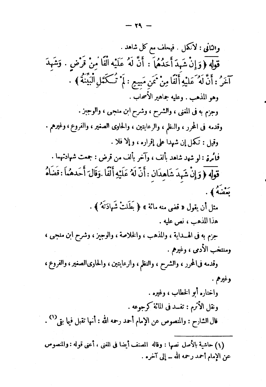 وَالثَّانِي: لَا تُكَمَّلُ، فَيَحْلِفُ مَعَ كُلِّ شَاهِدٍ. قَوْلُهُ (وَإِنْ شَهِدَ أَحَدُهُمَا: أَنَّ لَهُ عَلَيْهِ أَلْفًا مِنْ قَرْضٍ، وَشَهِدَ آخَرُ: أَنَّ لَهُ عَلَيْهِ أَلْفًا مِنْ ثَمَنِ مَبِيعٍ: لَمْ تُكَمَّلْ الْبَيِّنَةُ) ، وَهُوَ الْمَذْهَبُ، وَعَلَيْهِ جَمَاهِيرُ الْأَصْحَابِ، وَجَزَمَ بِهِ فِي الْمُغْنِي، وَالشَّرْحِ، وَشَرْحِ ابْنِ مُنَجَّا، وَالْوَجِيزِ وَقَدَّمَهُ فِي الْمُحَرَّرِ، وَالنَّظْمِ، وَالرِّعَايَتَيْنِ، وَالْحَاوِي الصَّغِيرِ، وَالْفُرُوعِ، وَغَيْرِهِمْ، وَقِيلَ: تُكَمَّلُ إنْ شَهِدَا عَلَى إقْرَارِهِ، وَإِلَّا فَلَا.