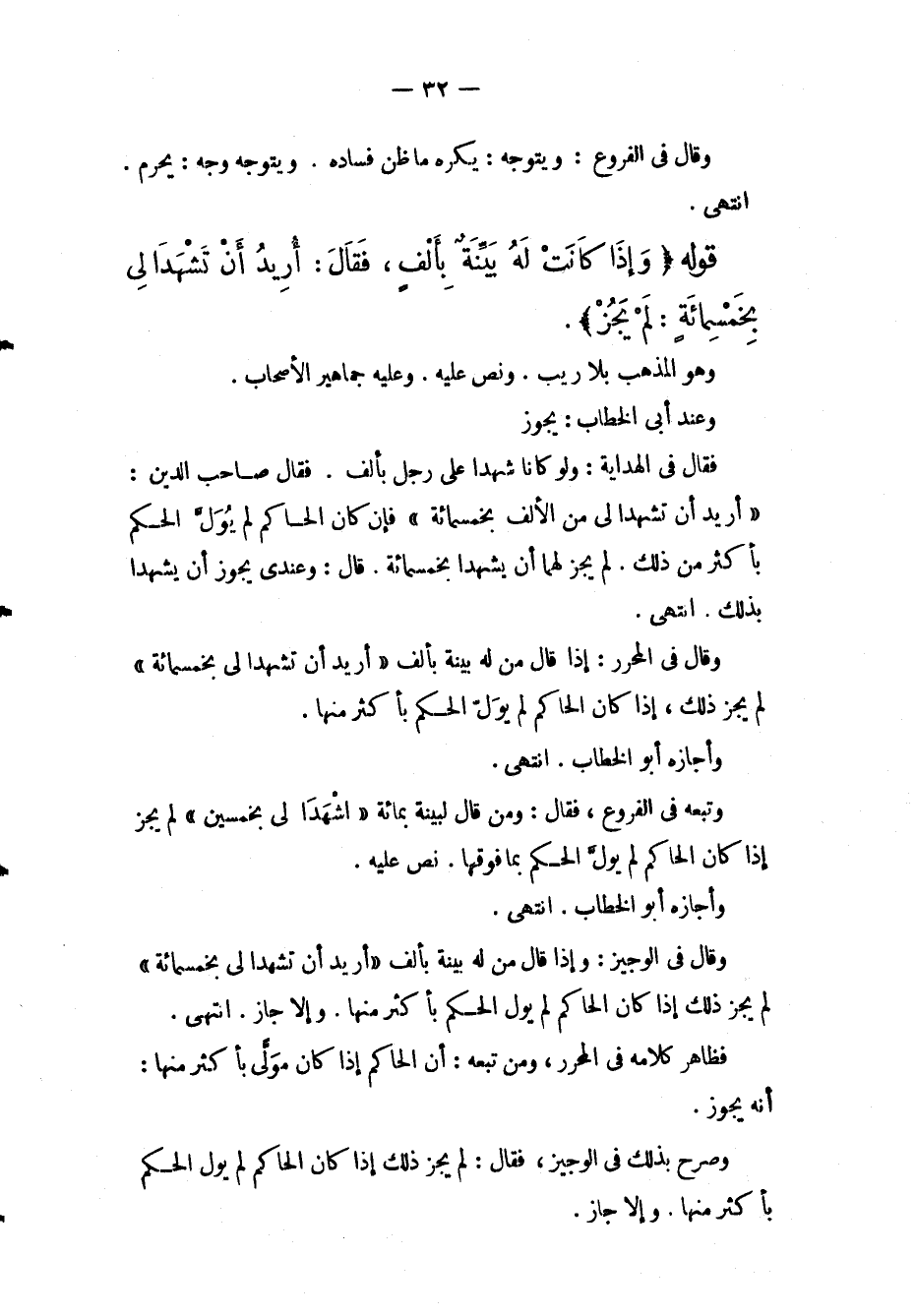 قَوْلُهُ (وَإِذَا كَانَتْ لَهُ بَيِّنَةٌ بِأَلْفٍ، فَقَالَ: أُرِيدُ أَنْ تَشْهَدَا لِي بِخَمْسِمِائَةٍ: لَمْ يَجُزْ) ، وَهُوَ الْمَذْهَبُ بِلَا رَيْبٍ، وَنَصَّ عَلَيْهِ، وَعَلَيْهِ جَمَاهِيرُ الْأَصْحَابِ، وَعِنْدَ أَبِي الْخَطَّابِ: يَجُوزُ فَقَالَ فِي الْهِدَايَةِ: وَلَوْ كَانَا شَهِدَا عَلَى رَجُلٍ بِأَلْفٍ، فَقَالَ صَاحِبُ الدَّيْنِ: " أُرِيدُ أَنْ تَشْهَدَا لِي مِنْ الْأَلْفِ بِخَمْسِمِائَةٍ " فَإِنْ كَانَ الْحَاكِمُ لَمْ يُوَلَّ الْحُكْمَ بِأَكْثَرَ مِنْ ذَلِكَ، لَمْ يَجُزْ لَهُمَا أَنْ يَشْهَدَا بِخَمْسِمِائَةٍ، قَالَ: وَعِنْدِي يَجُوزُ أَنْ يَشْهَدَا بِذَلِكَ. انْتَهَى. وَقَالَ فِي الْمُحَرَّرِ: إذَا قَالَ مَنْ لَهُ بَيِّنَةٌ بِأَلْفٍ " أُرِيدُ أَنْ تَشْهَدَا لِي بِخَمْسِمِائَةٍ " لَمْ يَجُزْ ذَلِكَ، إذَا كَانَ الْحَاكِمُ لَمْ يُوَلَّ الْحُكْمُ بِأَكْثَرَ مِنْهَا، وَأَجَازَهُ أَبُو الْخَطَّابِ. انْتَهَى. وَتَبِعَهُ فِي الْفُرُوعِ، فَقَالَ: وَمَنْ قَالَ لِبَيِّنَةٍ بِمِائَةٍ " اشْهَدَا لِي بِخَمْسِينَ " لَمْ يَجُزْ إذَا كَانَ الْحَاكِمُ لَمْ يُوَلَّ الْحُكْمَ بِمَا فَوْقَهَا، نَصَّ عَلَيْهِ، وَأَجَازَهُ أَبُو الْخَطَّابِ. انْتَهَى. وَقَالَ فِي الْوَجِيزِ: وَإِذَا قَالَ مَنْ لَهُ بَيِّنَةٌ بِأَلْفٍ " أُرِيدُ أَنْ تَشْهَدَا لِي بِخَمْسِمِائَةٍ " لَمْ يَجُزْ ذَلِكَ إذَا كَانَ الْحَاكِمُ لَمْ يُوَلَّ الْحُكْمَ بِأَكْثَرَ مِنْهَا، وَإِلَّا جَازَ. انْتَهَى.
