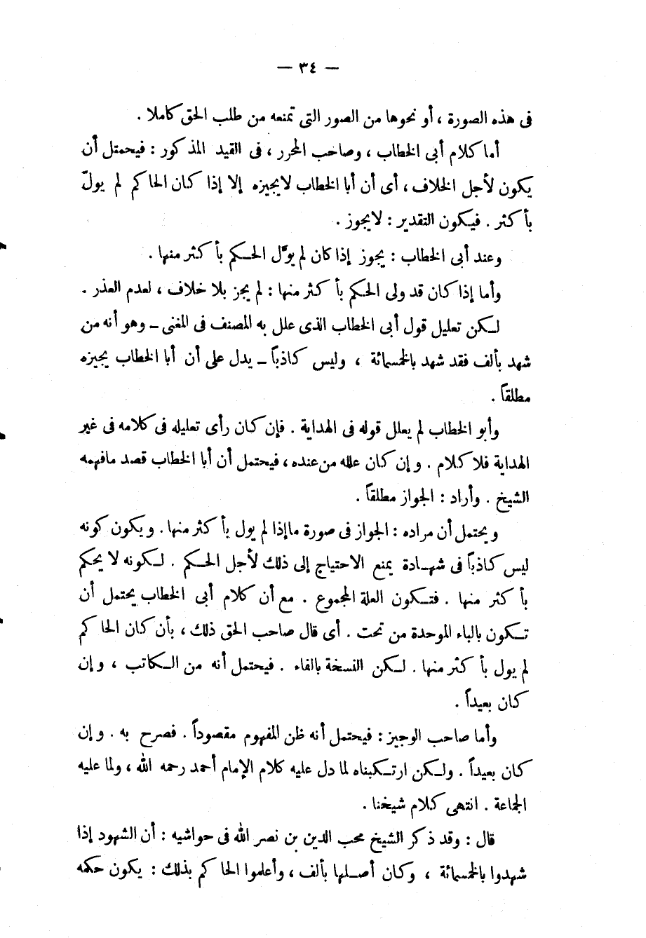 فِي هَذِهِ الصُّورَةِ، أَوْ نَحْوِهَا مِنْ الصُّوَرِ الَّتِي تَمْنَعُهُ مِنْ طَلَبِ الْحَقِّ كَامِلًا، أَمَّا كَلَامُ أَبِي الْخَطَّابِ، وَصَاحِبِ الْمُحَرَّرِ، فِي الْقَيْدِ الْمَذْكُورِ: فَيَحْتَمِلُ أَنْ يَكُونَ لِأَجْلِ الْخِلَافِ، أَيْ أَنَّ أَبَا الْخَطَّابِ لَا يُجِيزُهُ إلَّا إذَا كَانَ الْحَاكِمُ لَمْ يُوَلَّ بِأَكْثَرَ، فَيَكُونُ التَّقْدِيرُ: لَا يَجُوزُ، وَعِنْدَ أَبِي الْخَطَّابِ: يَجُوزُ إذَا كَانَ لَمْ يُوَلَّ الْحُكْمَ بِأَكْثَرَ مِنْهَا، وَأَمَّا إذَا كَانَ قَدْ وُلِّيَ الْحُكْمَ بِأَكْثَرَ مِنْهَا: لَمْ يَجُزْ بِلَا خِلَافٍ؛ لِعَدَمِ الْعُذْرِ، لَكِنْ تَعْلِيلُ قَوْلِ أَبِي الْخَطَّابِ الَّذِي عَلَّلَ بِهِ الْمُصَنِّفُ فِي الْمُغْنِي وَهُوَ أَنَّهُ مَنْ شَهِدَ بِأَلْفٍ فَقَدْ شَهِدَ بِالْخَمْسِمِائَةِ، وَلَيْسَ كَاذِبًا يَدُلُّ عَلَى أَنَّ أَبَا الْخَطَّابِ يُجِيزُهُ مُطْلَقًا، وَأَبُو الْخَطَّابِ لَمْ يُعَلِّلْ قَوْلَهُ فِي الْهِدَايَةِ، فَإِنْ كَانَ رَأَى تَعْلِيلَهُ فِي كَلَامِهِ فِي غَيْرِ الْهِدَايَةِ فَلَا كَلَامَ، وَإِنْ كَانَ عَلَّلَهُ مِنْ عِنْدِهِ، فَيَحْتَمِلُ أَنَّ أَبَا الْخَطَّابِ قَصَدَ مَا فَهِمَهُ الشَّيْخُ، وَأَرَادَ: الْجَوَازَ مُطْلَقًا.