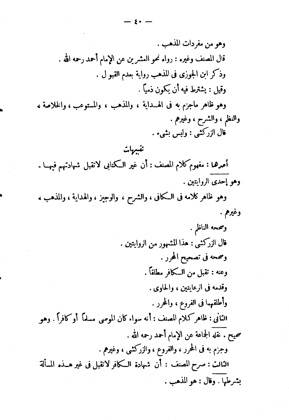 وَهُوَ مِنْ مُفْرَدَاتِ الْمَذْهَبِ، قَالَ الْمُصَنِّفُ وَغَيْرُهُ: رَوَاهُ نَحْوُ الْعِشْرِينَ عَنْ الْإِمَامِ أَحْمَدَ - رَحِمَهُ اللَّهُ -، وَذَكَرَ ابْنُ الْجَوْزِيِّ فِي الْمُذْهَبِ رِوَايَةً بِعَدَمِ الْقَبُولِ، وَقِيلَ: يُشْتَرَطُ فِيهِ أَنْ يَكُونَ ذِمِّيًّا، وَهُوَ ظَاهِرُ مَا جَزَمَ بِهِ فِي الْهِدَايَةِ، وَالْمُذْهَبِ، وَالْمُسْتَوْعِبِ، وَالْخُلَاصَةِ، وَالنَّظْمِ، وَالشَّرْحِ، وَغَيْرِهِمْ، قَالَ الزَّرْكَشِيُّ: وَلَيْسَ بِشَيْءٍ.