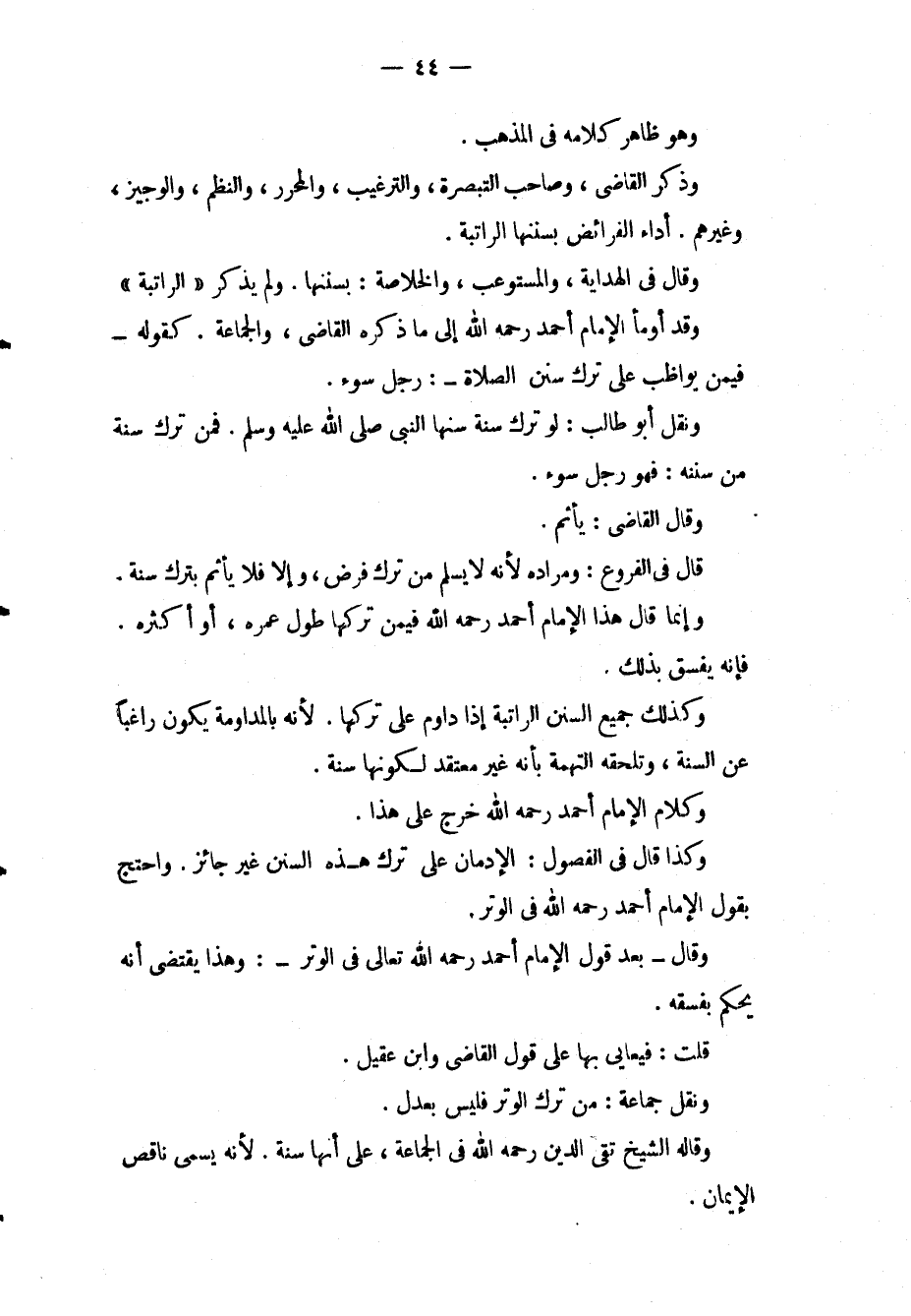 وَهُوَ ظَاهِرُ كَلَامِهِ فِي الْمَذْهَبِ، وَذَكَرَ الْقَاضِي، وَصَاحِبُ التَّبْصِرَةِ، وَالتَّرْغِيبِ، وَالْمُحَرَّرِ، وَالنَّظْمِ، وَالْوَجِيزِ، وَغَيْرُهُمْ، أَدَاءَ الْفَرَائِضِ بِسُنَنِهَا الرَّاتِبَةِ، وَقَالَ فِي الْهِدَايَةِ، وَالْمُسْتَوْعِبِ، وَالْخُلَاصَةِ: بِسُنَنِهَا، وَلَمْ يَذْكُرْ " الرَّاتِبَةَ " وَقَدْ أَوْمَأَ الْإِمَامُ أَحْمَدُ - رَحِمَهُ اللَّهُ - إلَى مَا ذَكَرَهُ الْقَاضِي، وَالْجَمَاعَةُ، كَقَوْلِهِ فِيمَنْ يُوَاظِبُ عَلَى تَرْكِ سُنَنِ الصَّلَاةِ: رَجُلُ سُوءٍ، وَنَقَلَ أَبُو طَالِبٍ: لَوْ تَرَكَ سُنَّةً سَنَّهَا النَّبِيُّ - صَلَّى اللَّهُ عَلَيْهِ وَسَلَّمَ -، فَمَنْ تَرَكَ سُنَّةً مِنْ سُنَنِهِ: فَهُوَ رَجُلُ سُوءٍ، وَقَالَ الْقَاضِي: يَأْثَمُ، قَالَ فِي الْفُرُوعِ: وَمُرَادُهُ لِأَنَّهُ لَا يَسْلَمُ مِنْ تَرْكِ فَرْضٍ، وَإِلَّا فَلَا يَأْثَمُ بِتَرْكِ سُنَّةٍ، وَإِنَّمَا قَالَ هَذَا الْإِمَامُ أَحْمَدُ - رَحِمَهُ اللَّهُ - فِيمَنْ تَرَكَهَا طُولَ عُمُرِهِ، أَوْ أَكْثَرَهُ، فَإِنَّهُ يَفْسُقُ بِذَلِكَ وَكَذَلِكَ جَمِيعُ السُّنَنِ الرَّاتِبَةِ إذَا دَاوَمَ عَلَى تَرْكِهَا؛ لِأَنَّهُ بِالْمُدَاوَمَةِ يَكُونُ رَاغِبًا عَنْ السُّنَّةِ، وَتَلْحَقُهُ التُّهْمَةُ بِأَنَّهُ غَيْرُ مُعْتَقِدٍ لِكَوْنِهَا سُنَّةً، وَكَلَامُ الْإِمَامِ أَحْمَدَ - رَحِمَهُ اللَّهُ - خَرَجَ عَلَى هَذَا، وَكَذَا قَالَ فِي الْفُصُولِ: الْإِدْمَانُ عَلَى تَرْكِ هَذِهِ السُّنَنِ غَيْرُ جَائِرٍ، وَاحْتَجَّ بِقَوْلِ الْإِمَامِ أَحْمَدَ - رَحِمَهُ اللَّهُ - فِي الْوِتْرِ، وَقَالَ بَعْدَ قَوْلِ الْإِمَامِ أَحْمَدَ - رَحِمَهُ اللَّهُ تَعَالَى - فِي الْوِتْرِ: وَهَذَا يَقْتَضِي أَنَّهُ يُحْكَمُ بِفِسْقِهِ، قُلْت: فَيُعَايَى بِهَا عَلَى قَوْلِ الْقَاضِي وَابْنِ عَقِيلٍ، وَنَقَلَ جَمَاعَةٌ مَنْ تَرَكَ الْوِتْرَ فَلَيْسَ بِعَدْلٍ وَقَالَهُ الشَّيْخُ تَقِيُّ الدِّينِ - رَحِمَهُ اللَّهُ - فِي الْجَمَاعَةِ، عَلَى أَنَّهَا سُنَّةٌ؛ لِأَنَّهُ يُسَمَّى نَاقِصَ الْإِيمَانِ