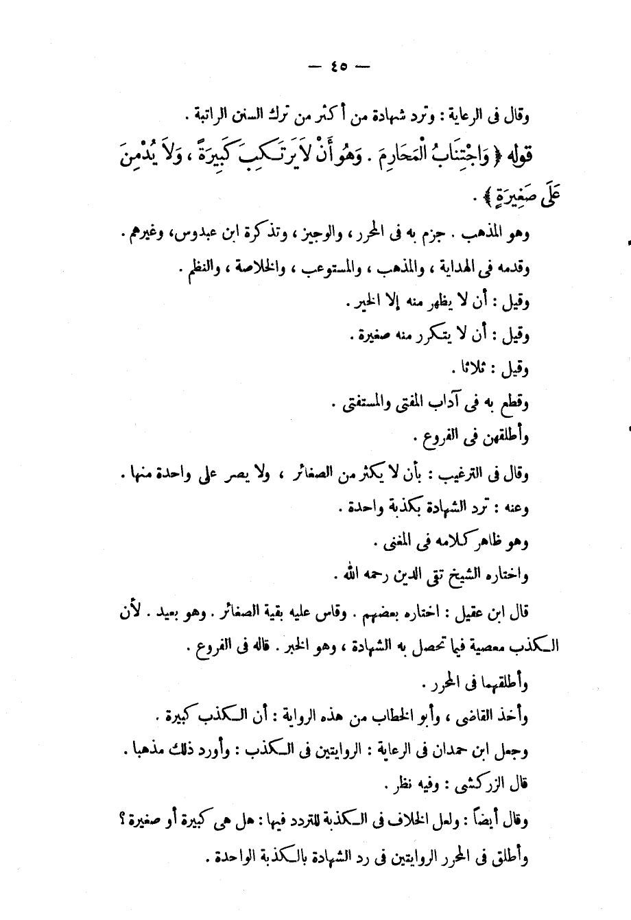 وَقَالَ فِي الرِّعَايَةِ: وَتُرَدُّ شَهَادَةُ مَنْ أَكْثَرَ مِنْ تَرْكِ السُّنَنِ الرَّاتِبَةِ. قَوْلُهُ (وَاجْتِنَابُ الْمَحَارِمَ، وَهُوَ أَنْ لَا يَرْتَكِبَ كَبِيرَةً، وَلَا يُدْمِنَ عَلَى صَغِيرَةٍ) وَهُوَ الْمَذْهَبُ، جَزَمَ بِهِ فِي الْمُحَرَّرِ، وَالْوَجِيزِ، وَتَذْكِرَةِ ابْنِ عَبْدُوسٍ، وَغَيْرِهِمْ، وَقَدَّمَهُ فِي الْهِدَايَةِ، وَالْمُذْهَبِ، وَالْمُسْتَوْعِبِ، وَالْخُلَاصَةِ، وَالنَّظْمِ، وَقِيلَ: أَنْ لَا يَظْهَرَ مِنْهُ إلَّا الْخَيْرُ، وَقِيلَ: أَنْ لَا يَتَكَرَّرَ مِنْهُ صَغِيرَةٌ، وَقِيلَ: ثَلَاثًا، وَقَطَعَ بِهِ فِي آدَابِ الْمُفْتِي وَالْمُسْتَفْتِي، وَأَطْلَقَهُنَّ فِي الْفُرُوعِ، وَقَالَ فِي التَّرْغِيبِ: بِأَنْ لَا يُكْثِرَ مِنْ الصَّغَائِرِ، وَلَا يُصِرَّ عَلَى وَاحِدَةٍ مِنْهَا، وَعَنْهُ: تُرَدُّ الشَّهَادَةُ بِكِذْبَةٍ وَاحِدَةٍ، وَهُوَ ظَاهِرُ كَلَامِهِ فِي الْمُغْنِي، وَاخْتَارَهُ الشَّيْخُ تَقِيُّ الدِّينِ - رَحِمَهُ اللَّهُ -، قَالَ ابْنُ عَقِيلٍ: اخْتَارَهُ بَعْضُهُمْ. وَقَاسَ عَلَيْهِ بَقِيَّةَ الصَّغَائِرِ، وَهُوَ بَعِيدٌ؛ لِأَنَّ الْكَذِبَ مَعْصِيَةٌ فِيمَا تَحْصُلُ بِهِ الشَّهَادَةُ، وَهُوَ الْخَبَرُ، قَالَهُ فِي الْفُرُوعِ، وَأَطْلَقَهُمَا فِي الْمُحَرَّرِ، وَأَخَذَ الْقَاضِي، وَأَبُو الْخَطَّابِ مِنْ هَذِهِ الرِّوَايَةِ: أَنَّ الْكَذِبَ كَبِيرَةٌ، وَجَعَلَ ابْنُ حَمْدَانَ فِي الرِّعَايَةِ: الرِّوَايَتَيْنِ فِي الْكَذِبِ: وَأَوْرَدَ ذَلِكَ مَذْهَبًا، قَالَ الزَّرْكَشِيُّ: وَفِيهِ نَظَرٌ، وَقَالَ أَيْضًا: وَلَعَلَّ الْخِلَافَ فِي الْكِذْبَةِ لِلتَّرَدُّدِ فِيهَا: هَلْ هِيَ كَبِيرَةٌ أَوْ صَغِيرَةٌ؟ وَأَطْلَقَ فِي الْمُحَرَّرِ الرِّوَايَتَيْنِ فِي رَدِّ الشَّهَادَةِ بِالْكِذْبَةِ الْوَاحِدَةِ،
