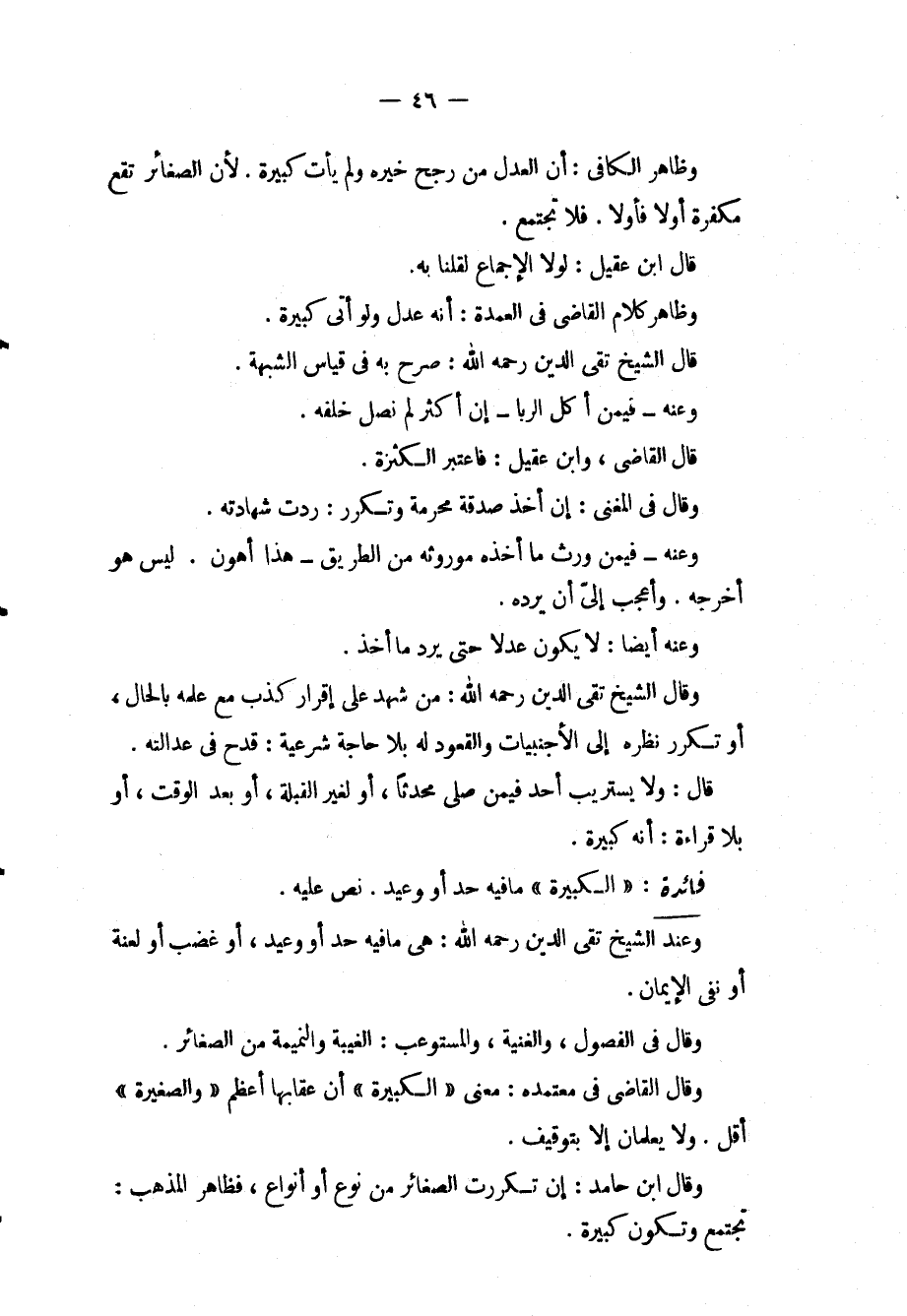 وَظَاهِرُ الْكَافِي: أَنَّ الْعَدْلَ مَنْ رَجَحَ خَيْرُهُ وَلَمْ يَأْتِ كَبِيرَةً؛ لِأَنَّ الصَّغَائِرَ تَقَعُ مُكَفَّرَةً أَوَّلًا فَأَوَّلًا، فَلَا تَجْتَمِعُ، قَالَ ابْنُ عَقِيلٍ: لَوْلَا الْإِجْمَاعُ لَقُلْنَا بِهِ، وَظَاهِرُ كَلَامِ الْقَاضِي فِي الْعُمْدَةِ: أَنَّهُ عَدْلٌ وَلَوْ أَتَى كَبِيرَةً، قَالَ الشَّيْخُ تَقِيُّ الدِّينِ - رَحِمَهُ اللَّهُ -: صَرَّحَ بِهِ فِي قِيَاسِ الشُّبْهَةِ، وَعَنْهُ فِيمَنْ أَكَلَ الرِّبَا إنْ أَكْثَرَ لَمْ نُصَلِّ خَلْفَهُ، قَالَ الْقَاضِي، وَابْنُ عَقِيلٍ: فَاعْتَبَرَ الْكَثْرَةَ، وَقَالَ فِي الْمُغْنِي: إنْ أَخَذَ صَدَقَةً مُحَرَّمَةً وَتَكَرَّرَ: رُدَّتْ شَهَادَتُهُ، وَعَنْهُ فِيمَنْ وَرِثَ مَا أَخَذَهُ مَوْرُوثُهُ مِنْ الطَّرِيقِ هَذَا أَهْوَنُ، لَيْسَ هُوَ أَخْرَجَهُ، وَأَعْجَبُ إلَى أَنْ يَرُدَّهُ، وَعَنْهُ أَيْضًا: لَا يَكُونُ عَدْلًا حَتَّى يَرُدَّ مَا أَخَذَ، وَقَالَ الشَّيْخُ تَقِيُّ الدِّينِ - رَحِمَهُ اللَّهُ -: مَنْ شَهِدَ عَلَى إقْرَارِ كَذِبٍ مَعَ عِلْمِهِ بِالْحَالِ "، أَوْ تَكَرَّرَ نَظَرُهُ إلَى الْأَجْنَبِيَّاتِ وَالْقُعُودِ لَهُ بِلَا حَاجَةٍ شَرْعِيَّةٍ: قُدِحَ فِي عَدَالَتِهِ، قَالَ: وَلَا يَسْتَرِيبُ أَحَدٌ فِيمَنْ صَلَّى مُحْدِثًا، أَوْ لِغَيْرِ الْقِبْلَةِ، أَوْ بَعْدَ الْوَقْتِ، أَوْ بِلَا قِرَاءَةٍ: أَنَّهُ كَبِيرَةٌ.