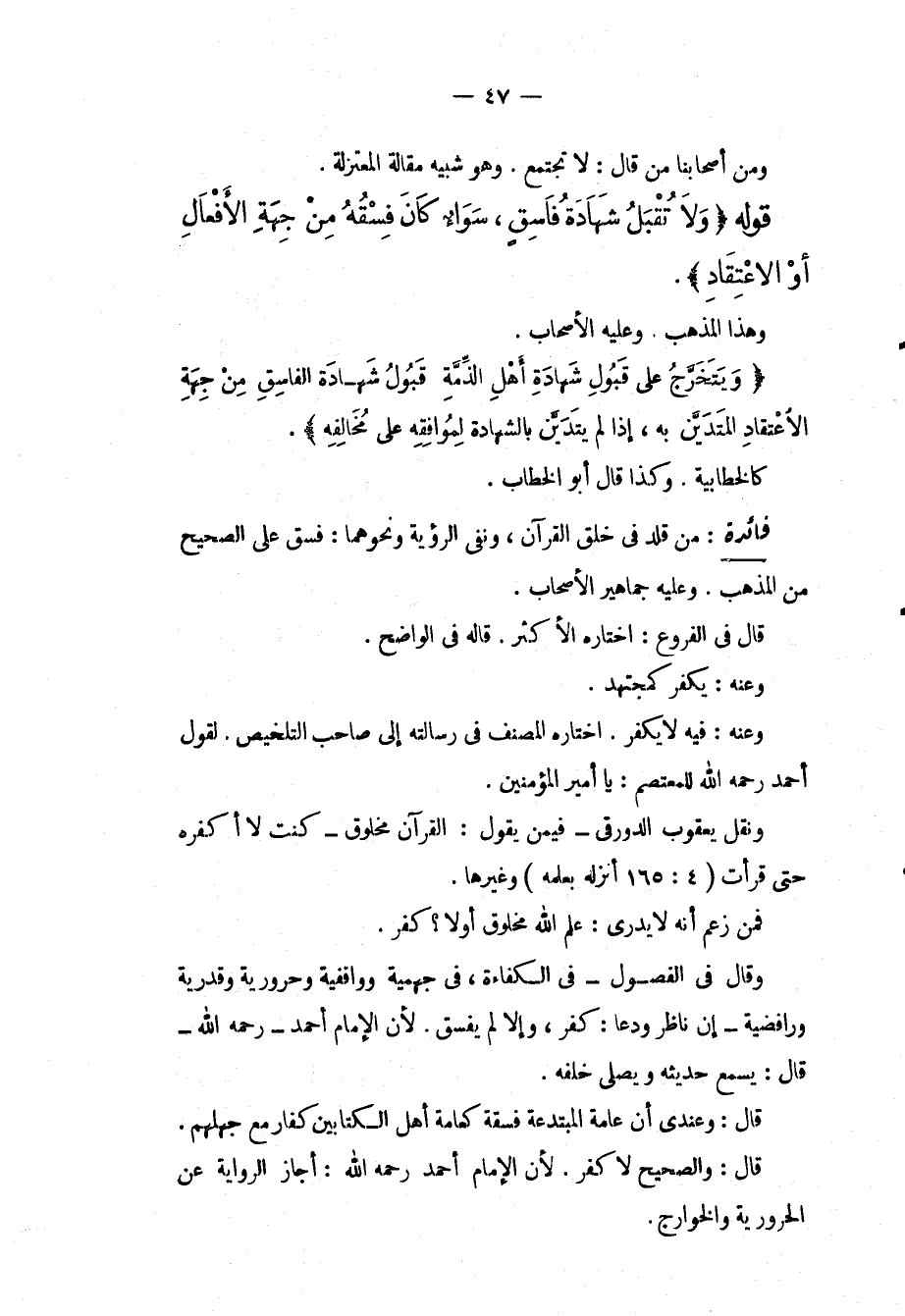 مَنْ قَلَّدَ فِي خَلْقِ الْقُرْآنِ، وَنَفْيِ الرُّؤْيَةِ وَنَحْوِهِمَا: فَسَقَ عَلَى الصَّحِيحِ مِنْ الْمَذْهَبِ، وَعَلَيْهِ جَمَاهِيرُ الْأَصْحَابِ، قَالَ فِي الْفُرُوعِ: اخْتَارَهُ الْأَكْثَرُ، قَالَهُ فِي الْوَاضِحِ وَعَنْهُ: يَكْفُرُ كَمُجْتَهِدٍ، وَعَنْهُ: فِيهِ لَا يَكْفُرُ، اخْتَارَهُ الْمُصَنِّفُ فِي رِسَالَتِهِ إلَى صَاحِبِ التَّلْخِيصِ، لِقَوْلِ أَحْمَدَ - رَحِمَهُ اللَّهُ - لِلْمُعْتَصِمِ: يَا أَمِيرَ الْمُؤْمِنِينَ، وَنَقَلَ يَعْقُوبُ الدَّوْرَقِيُّ فِيمَنْ يَقُولُ: الْقُرْآنُ مَخْلُوقٌ كُنْت لَا أُكَفِّرُهُ حَتَّى قَرَأْت {أَنْزَلَهُ بِعِلْمِهِ} [النساء: 166] وَغَيْرَهَا، فَمَنْ زَعَمَ أَنَّهُ لَا يَدْرِي: عِلْمُ اللَّهِ مَخْلُوقٌ أَوْ لَا؟ كَفَرَ وَقَالَ فِي الْفُصُولِ فِي الْكَفَاءَةِ، فِي جَهْمِيَّةٍ وَوَاقِفِيَّةٍ وَحَرُورِيَّةٍ وَقَدَرِيَّةٍ وَرَافِضِيَّةٍ إنْ نَاظَرَ وَدَعَا: كَفَرَ، وَإِلَّا لَمْ يَفْسُقْ؛ لِأَنَّ الْإِمَامَ أَحْمَدَ - رَحِمَهُ اللَّهُ - قَالَ: يُسْمَعُ حَدِيثُهُ وَيُصَلَّى خَلْفَهُ، قَالَ: وَعِنْدِي أَنَّ عَامَّةَ الْمُبْتَدِعَةِ فَسَقَةٌ كَعَامَّةِ أَهْلِ الْكِتَابَيْنِ كُفَّارٌ مَعَ جَهْلِهِمْ، قَالَ: وَالصَّحِيحُ لَا كُفْرَ، لِأَنَّ الْإِمَامَ أَحْمَدَ - رَحِمَهُ اللَّهُ -: أَجَازَ الرِّوَايَةَ عَنْ الْحَرُورِيَّةِ وَالْخَوَارِجِ