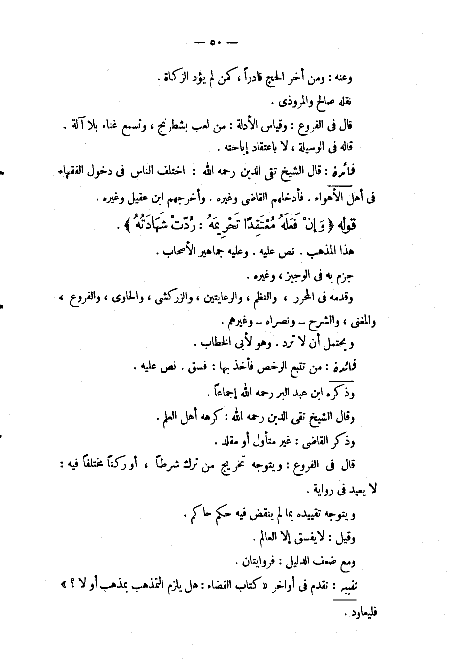 قَالَ الشَّيْخُ تَقِيُّ الدِّينِ - رَحِمَهُ اللَّهُ -: اخْتَلَفَ النَّاسُ فِي دُخُولِ الْفُقَهَاءِ فِي أَهْلِ الْأَهْوَاءِ، فَأَدْخَلَهُمْ الْقَاضِي وَغَيْرُهُ، وَأَخْرَجَهُمْ ابْنُ عَقِيلٍ وَغَيْرُهُ. قَوْلُهُ (وَإِنْ فَعَلَهُ مُعْتَقِدًا تَحْرِيمَهُ: رُدَّتْ، شَهَادَتُهُ) ، هَذَا الْمَذْهَبُ، نَصَّ عَلَيْهِ، وَعَلَيْهِ جَمَاهِيرُ الْأَصْحَابِ، جَزَمَ بِهِ فِي الْوَجِيزِ، وَغَيْرِهِ، وَقَدَّمَهُ فِي الْمُحَرَّرِ، وَالنَّظْمِ، وَالرِّعَايَتَيْنِ، وَالزَّرْكَشِيِّ، وَالْحَاوِي، وَالْفُرُوعِ، وَالْمُغْنِي، وَالشَّرْحِ وَنَصَرَاهُ وَغَيْرِهِمْ، وَيُحْتَمَلُ أَنْ لَا تُرَدَّ، وَهُوَ قَوْلُ أَبِي الْخَطَّابِ.
