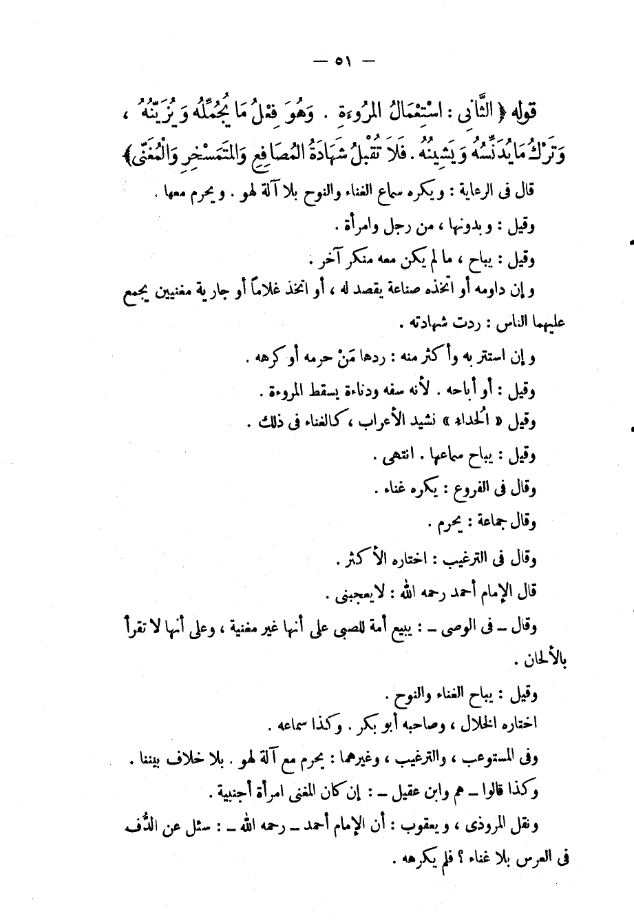 قَوْلُهُ (الثَّانِي: اسْتِعْمَالُ الْمُرُوءَةِ، وَهُوَ فِعْلُ مَا يُجَمِّلُهُ وَيُزَيِّنُهُ، وَتَرْكُ مَا يُدَنِّسُهُ وَيَشِينُهُ، فَلَا تُقْبَلُ شَهَادَةُ الْمُصَافِعِ وَالْمُتَمَسْخِرِ وَالْمُغَنِّي) قَالَ فِي الرِّعَايَةِ: وَيُكْرَهُ سَمَاعُ الْغِنَاءِ وَالنُّوحِ بِلَا آلَةِ لَهْوٍ، وَيَحْرُمُ مَعَهَا، وَقِيلَ: وَبِدُونِهَا، مِنْ رَجُلٍ وَامْرَأَةٍ، وَقِيلَ: يُبَاحُ، مَا لَمْ يَكُنْ مَعَهُ مُنْكَرٌ آخَرُ، وَإِنْ دَاوَمَهُ أَوْ اتَّخَذَهُ صِنَاعَةً يُقْصَدُ لَهُ، أَوْ اتَّخَذَ غُلَامًا أَوْ جَارِيَةً مُغَنِّيَيْنِ يَجْمَعُ عَلَيْهِمَا النَّاسَ: رُدَّتْ شَهَادَتُهُ وَإِنْ اسْتَتَرَ بِهِ وَأَكْثَرَ مِنْهُ: رَدَّهَا مَنْ حَرَّمَهُ أَوْ كَرِهَهُ، وَقِيلَ: أَوْ أَبَاحَهُ، لِأَنَّهُ سَفَهٌ وَدَنَاءَةٌ يُسْقِطُ الْمُرُوءَةَ، وَقِيلَ " الْحُدَاءُ " نَشِيدُ الْأَعْرَابِ. كَالْغِنَاءِ فِي ذَلِكَ، وَقِيلَ: يُبَاحُ سَمَاعُهَا. انْتَهَى. وَقَالَ فِي الْفُرُوعِ: يُكْرَهُ غِنَاءٌ، وَقَالَ جَمَاعَةٌ: يَحْرُمُ، وَقَالَ فِي التَّرْغِيبِ، اخْتَارَهُ الْأَكْثَرُ، قَالَ الْإِمَامُ أَحْمَدُ - رَحِمَهُ اللَّهُ -: لَا يُعْجِبُنِي، وَقَالَ فِي الْوَصِيِّ: يَبِيعُ أَمَةً لِلصَّبِيِّ عَلَى أَنَّهَا غَيْرُ مُغَنِّيَةٍ، وَعَلَى أَنَّهَا لَا تَقْرَأُ بِالْأَلْحَانِ، وَقِيلَ: يُبَاحُ الْغِنَاءُ وَالنَّوْحُ، اخْتَارَهُ الْخَلَّالُ، وَصَاحِبُهُ أَبُو بَكْرٍ، وَكَذَا سَمَاعُهُ، وَفِي الْمُسْتَوْعِبِ، وَالتَّرْغِيبِ، وَغَيْرِهِمَا: يَحْرُمُ مَعَ آلَةِ لَهْوٍ، بِلَا خِلَافٍ بَيْنَنَا، وَكَذَا قَالُوا هُمْ وَابْنُ عَقِيلٍ: إنْ كَانَ الْمُغَنِّي امْرَأَةً أَجْنَبِيَّةً، وَنَقَلَ الْمَرُّوذِيُّ، وَيَعْقُوبُ: أَنَّ الْإِمَامَ أَحْمَدَ - رَحِمَهُ اللَّهُ -: سُئِلَ عَنْ الدُّفِّ فِي الْعُرْسِ بِلَا غِنَاءٍ؟ فَلَمْ يَكْرَهْهُ.