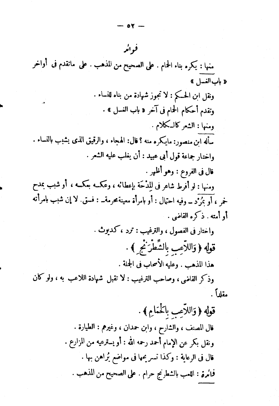 مِنْهَا يُكْرَهُ بِنَاءُ الْحَمَّامِ، عَلَى الصَّحِيحِ مِنْ الْمَذْهَبِ، عَلَى مَا تَقَدَّمَ فِي أَوَاخِرِ " بَابِ الْغُسْلِ " وَنَقَلَ ابْنُ الْحَكَمِ: لَا تَجُوزُ شَهَادَةُ مَنْ بَنَاهُ لِلنِّسَاءِ، وَتَقَدَّمَ أَحْكَامُ الْحَمَّامِ فِي آخِرِ " بَابِ الْغُسْلِ ". وَمِنْهَا: الشِّعْرُ كَالْكَلَامِ، سَأَلَهُ ابْنُ مَنْصُورٍ: مَا يُكْرَهُ مِنْهُ؟ قَالَ: الْهِجَاءُ، وَالرَّقِيقُ الَّذِي يُشَبِّبُ بِالنِّسَاءِ، وَاخْتَارَهُ جَمَاعَةٌ قَوْلُ أَبِي عُبَيْدٍ: أَنْ يَغْلِبَ عَلَيْهِ الشِّعْرُ، قَالَ فِي الْفُرُوعِ: وَهُوَ أَظْهَرُ. وَمِنْهَا: لَوْ أَفْرَطَ شَاعِرٌ فِي الْمِدْحَةِ بِإِعْطَائِهِ، وَعَكْسُهُ بِعَكْسِهِ، أَوْ شَبَّبَ بِمَدْحِ خَمْرٍ، أَوْ بِمُرْدٍ وَفِيهِ احْتِمَالٌ: أَوْ بِامْرَأَةٍ مُعَيَّنَةٍ مُحَرَّمَةٍ: فَسَقَ، لَا إنْ شَبَّبَ بِامْرَأَتِهِ أَوْ أَمَتِهِ، ذَكَرَهُ الْقَاضِي، وَاخْتَارَ فِي الْفُصُولِ، وَالتَّرْغِيبِ: تُرَدُّ. كَدَيُّوثٍ