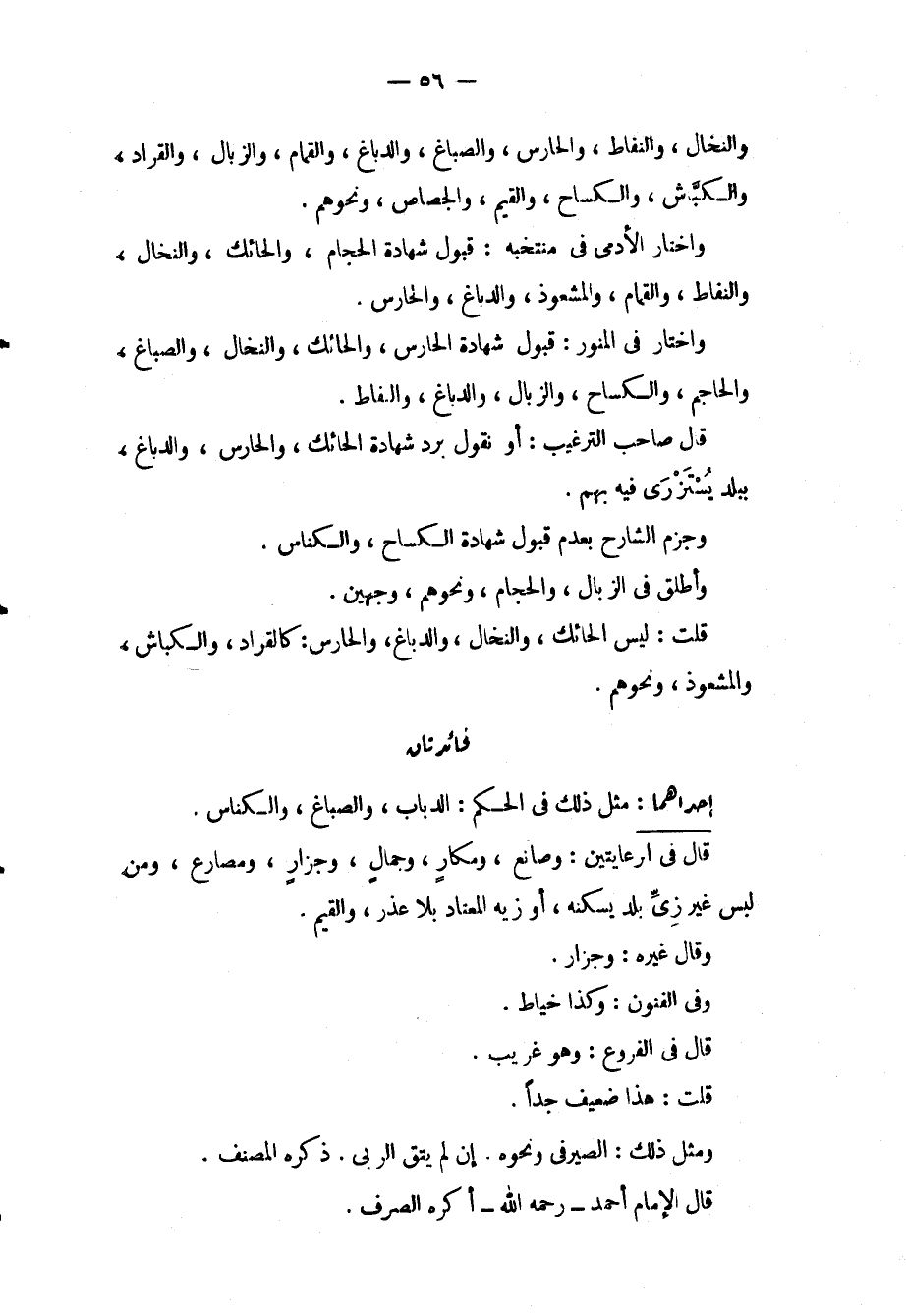 إحْدَاهُمَا: مِثْلُ ذَلِكَ فِي الْحُكْمِ: الدَّبَّابُ، وَالصَّبَّاغُ، وَالْكَنَّاسُ، قَالَ فِي الرِّعَايَتَيْنِ: وَصَانِعٍ، وَمُكَارٍ، وَجَمَّالٍ، وَجَزَّارٍ، وَمُصَارِعٍ، وَمَنْ لَبِسَ غَيْرَ زِيِّ بَلَدٍ يَسْكُنُهُ، أَوْ زِيَّهُ الْمُعْتَادَ بِلَا عُذْرٍ، وَالْقَيِّمِ، وَقَالَ غَيْرَهُ: وَجَزَّارٍ، وَفِي الْفُنُونِ: وَكَذَا خَيَّاطٌ، قَالَ فِي الْفُرُوعِ: وَهُوَ غَرِيبٌ، قُلْت: هَذَا ضَعِيفٌ جِدًّا.
