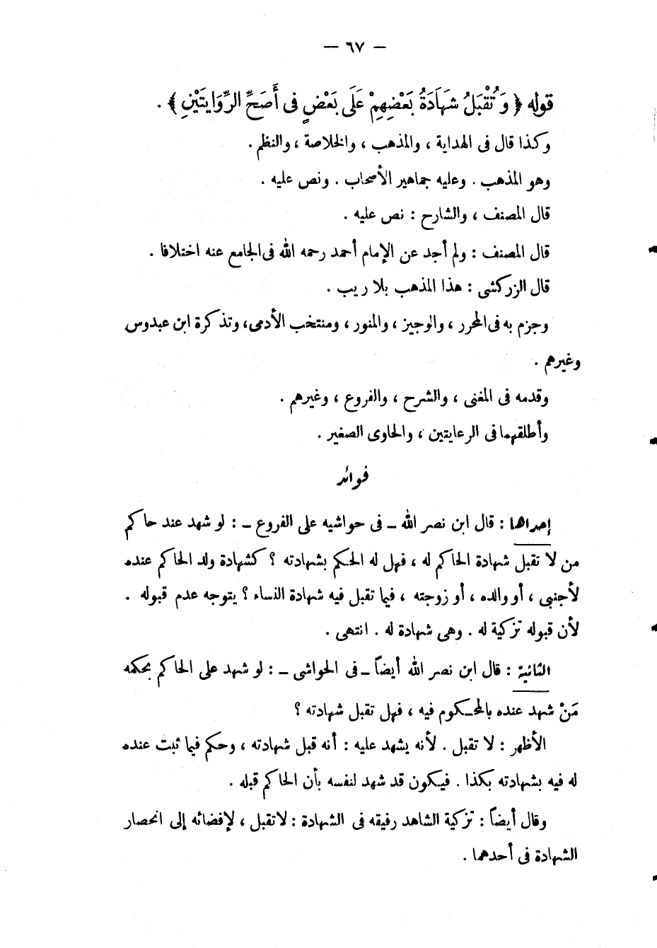 فَوَائِدُ إحْدَاهَا: قَالَ ابْنُ نَصْرِ اللَّهِ فِي حَوَاشِيهِ عَلَى الْفُرُوعِ: لَوْ شَهِدَ عِنْدَ حَاكِمٍ مَنْ لَا تُقْبَلُ شَهَادَةُ الْحَاكِمِ لَهُ، فَهَلْ لَهُ الْحَكَمُ بِشَهَادَتِهِ؟ كَشَهَادَةِ وَلَدِ الْحَاكِمِ عِنْدَهُ لِأَجْنَبِيٍّ، أَوْ وَالِدِهِ، أَوْ زَوْجَتِهِ، فِيمَا تُقْبَلُ فِيهِ شَهَادَةُ النِّسَاءِ؟ يَتَوَجَّهُ عَدَمُ قَبُولِهِ؛ لِأَنَّ قَبُولَهُ تَزْكِيَةٌ لَهُ، وَهِيَ شَهَادَةٌ لَهُ. انْتَهَى.