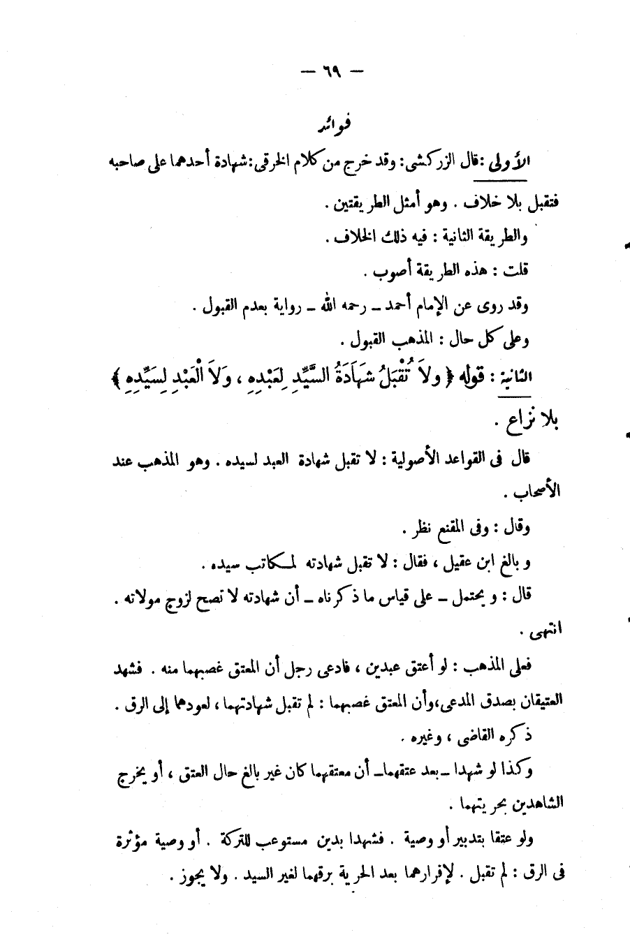 الثَّانِيَةُ: قَوْلُهُ (وَلَا تُقْبَلُ شَهَادَةُ السَّيِّدِ لِعَبْدِهِ، وَلَا الْعَبْدِ لِسَيِّدِهِ) بِلَا نِزَاعٍ، قَالَ فِي الْقَوَاعِدِ الْأُصُولِيَّةِ: لَا تُقْبَلُ شَهَادَةُ الْعَبْدِ لِسَيِّدِهِ، وَهُوَ الْمَذْهَبُ عِنْدَ الْأَصْحَابِ، وَقَالَ: وَفِي الْمُقْنِعِ نَظَرٌ، وَبَالَغَ ابْنُ عَقِيلٍ، فَقَالَ: لَا تُقْبَلُ شَهَادَتُهُ لِمُكَاتَبِ سَيِّدِهِ، قَالَ: وَيُحْتَمَلُ عَلَى قِيَاسِ مَا ذَكَرْنَاهُ أَنَّ شَهَادَتَهُ لَا تَصِحُّ لِزَوْجِ مَوْلَاتِهِ. انْتَهَى. فَعَلَى الْمَذْهَبِ: لَوْ أَعْتَقَ عَبْدَيْنِ، فَادَّعَى رَجُلٌ أَنَّ الْمُعْتِقَ غَصَبَهُمَا مِنْهُ، فَشَهِدَ الْعَتِيقَانِ بِصِدْقِ الْمُدَّعِي، وَأَنَّ الْمُعْتِقَ غَصَبَهُمَا: لَمْ تُقْبَلْ شَهَادَتُهُمَا؛ لِعَوْدِهِمَا إلَى الرِّقِّ، ذَكَرَهُ الْقَاضِي، وَغَيْرُهُ وَكَذَا لَوْ شَهِدَا بَعْدَ عِتْقِهِمَا أَنَّ مُعْتِقَهُمَا كَانَ غَيْرَ بَالِغٍ حَالَ الْعِتْقِ، أَوْ يُخْرِجُ الشَّاهِدَيْنِ بِحُرِّيَّتِهِمَا، وَلَوْ عَتَقَا بِتَدْبِيرٍ أَوْ وَصِيَّةٍ، فَشَهِدَا بِدَيْنٍ مُسْتَوْعِبٍ لِلتَّرِكَةِ، أَوْ وَصِيَّةٍ مُؤَثِّرَةٍ فِي الرِّقِّ: لَمْ تُقْبَلْ؛ لِإِقْرَارِهِمَا بَعْدَ الْحُرِّيَّةِ بِرِقِّهِمَا لِغَيْرِ السَّيِّدِ، وَلَا يَجُوزُ.