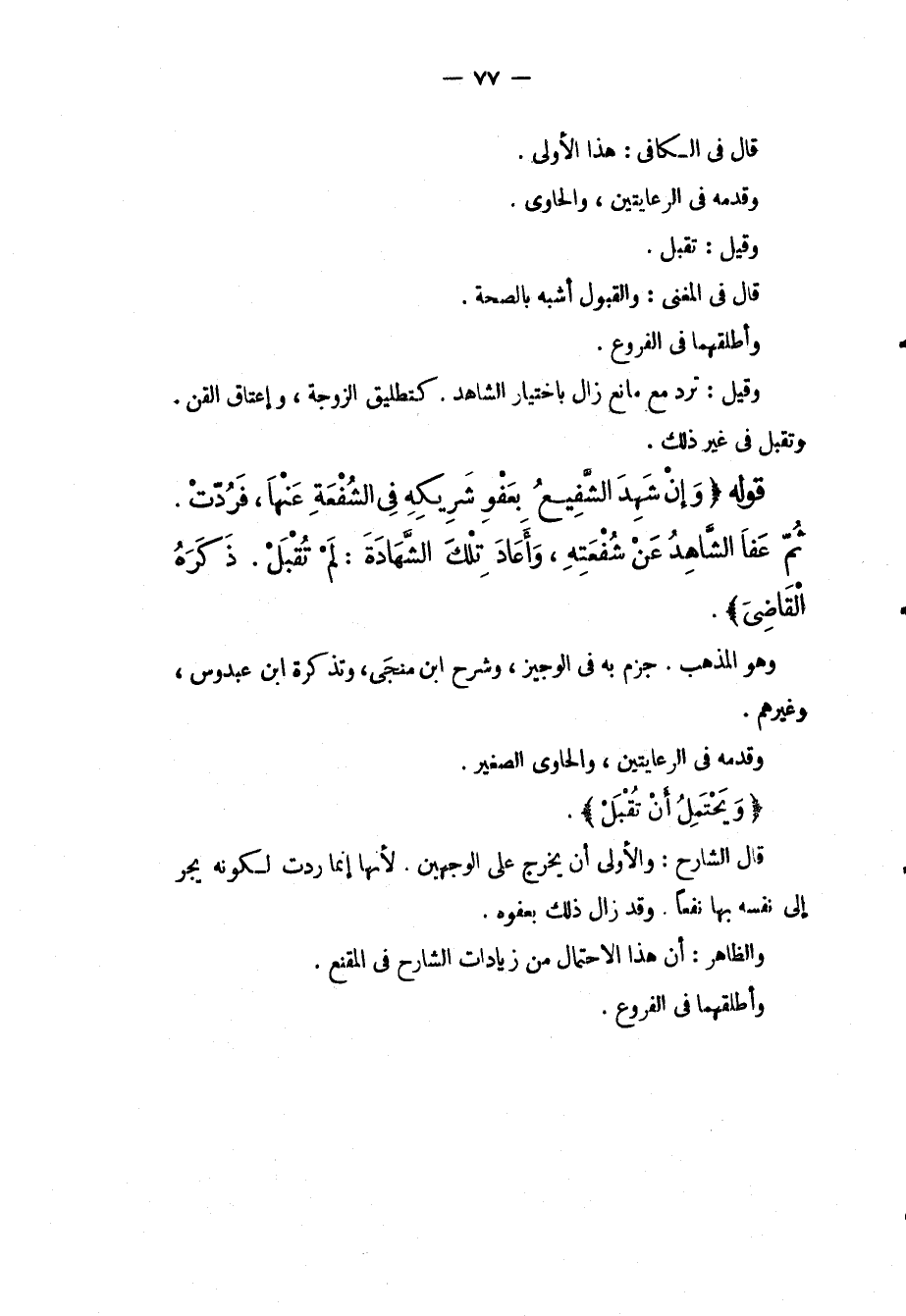 قَوْلُهُ (وَإِنْ شَهِدَ الشَّفِيعُ بِعَفْوِ شَرِيكِهِ فِي الشُّفْعَةِ عَنْهَا، فَرُدَّتْ، ثُمَّ عَفَا الشَّاهِدُ عَنْ شُفْعَتِهِ، وَأَعَادَ تِلْكَ الشَّهَادَةَ: لَمْ تُقْبَلْ، ذَكَرَهُ الْقَاضِي) ، وَهُوَ الْمَذْهَبُ، جَزَمَ بِهِ فِي الْوَجِيزِ، وَشَرْحِ ابْنِ مُنَجَّا، وَتَذْكِرَةِ ابْنِ عَبْدُوسٍ وَغَيْرِهِمْ، وَقَدَّمَهُ فِي الرِّعَايَتَيْنِ، وَالْحَاوِي الصَّغِيرِ، (وَيُحْتَمَلُ أَنْ تُقْبَلَ) ، قَالَ الشَّارِحُ: وَالْأَوْلَى أَنْ يَخْرُجَ عَلَى الْوَجْهَيْنِ؛ لِأَنَّهَا إنَّمَا رُدَّتْ لِكَوْنِهِ يَجُرُّ إلَى نَفْسِهِ بِهَا نَفْعًا، وَقَدْ زَالَ ذَلِكَ بِعَفْوِهِ، وَالظَّاهِرُ: أَنَّ هَذَا الِاحْتِمَالَ مِنْ زِيَادَاتِ الشَّارِحِ فِي الْمُقْنِعِ وَأَطْلَقَهُمَا فِي الْفُرُوعِ.