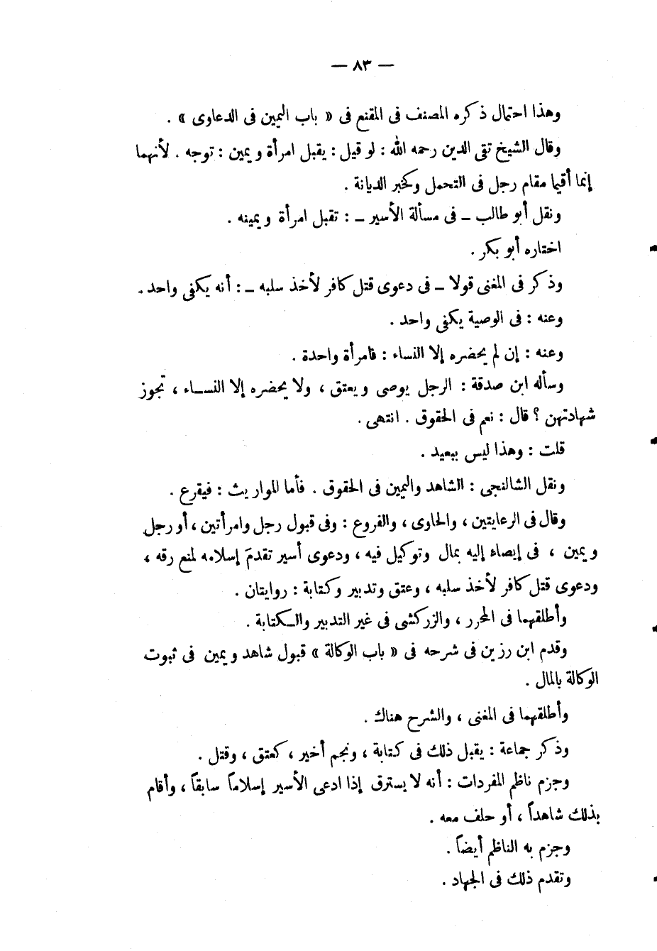 وَهَذَا احْتِمَالٌ ذَكَرَهُ الْمُصَنِّفُ فِي الْمُقْنِعِ فِي " بَابِ الْيَمِينِ فِي الدَّعَاوَى "، وَقَالَ الشَّيْخُ تَقِيُّ الدِّينِ - رَحِمَهُ اللَّهُ -: لَوْ قِيلَ: يُقْبَلُ امْرَأَةٌ وَيَمِينٌ: تَوَجَّهَ؛ لِأَنَّهُمَا إنَّمَا أُقِيمَا مَقَامَ رَجُلٍ فِي التَّحَمُّلِ وَكَخَبَرِ الدِّيَانَةِ، وَنَقَلَ أَبُو طَالِبٍ فِي مَسْأَلَةِ الْأَسِيرِ: تُقْبَلُ امْرَأَةٌ وَيَمِينُهُ، اخْتَارَهُ أَبُو بَكْرٍ، وَذَكَرَ فِي الْمُغْنِي قَوْلًا فِي دَعْوَى قَتْلِ كَافِرٍ لِأَخْذِ سَلَبِهِ: أَنَّهُ يَكْفِي وَاحِدٌ، وَعَنْهُ: فِي الْوَصِيَّةِ يَكْفِي وَاحِدٌ، وَعَنْهُ: إنْ لَمْ يَحْضُرْهُ إلَّا النِّسَاءُ: فَامْرَأَةٌ وَاحِدَةٌ، وَسَأَلَهُ ابْنُ صَدَقَةَ: الرَّجُلُ يُوصِي وَيُعْتِقُ، وَلَا يَحْضُرُهُ إلَّا النِّسَاءُ، تَجُوزُ شَهَادَتَيْنِ؟ قَالَ: نَعَمْ فِي الْحُقُوقِ. انْتَهَى. قُلْت: وَهَذَا لَيْسَ بِبَعِيدٍ وَنَقَلَ الشَّالَنْجِيُّ: الشَّاهِدُ وَالْيَمِينُ فِي الْحُقُوقِ، فَأَمَّا الْمَوَارِيثُ: فَيُقْرَعُ، وَقَالَ فِي الرِّعَايَتَيْنِ، وَالْحَاوِي، وَالْفُرُوعِ: وَفِي قَبُولِ رَجُلٍ وَامْرَأَتَيْنِ، أَوْ رَجُلٍ وَيَمِينٍ، فِي إيصَاءٍ إلَيْهِ بِمَالٍ وَتَوْكِيلٍ فِيهِ، وَدَعْوَى أَسِيرٍ تَقَدَّمَ إسْلَامُهُ لِمَنْعِ رِقِّهِ، وَدَعْوَى قَتْلِ كَافِرٍ لِأَخْذِ سَلَبِهِ، وَعِتْقٍ وَتَدْبِيرٍ وَكِتَابَةٍ: رِوَايَتَانِ، وَأَطْلَقَهُمَا فِي الْمُحَرَّرِ، وَالزَّرْكَشِيُّ فِي غَيْرِ التَّدْبِيرِ وَالْكِتَابَةِ، وَقَدَّمَ ابْنُ رَزِينٍ فِي شَرْحِهِ فِي " بَابِ الْوَكَالَةِ " قَبُولَ شَاهِدٍ وَيَمِينٍ فِي ثُبُوتِ الْوَكَالَةِ بِالْمَالِ، وَأَطْلَقَهُمَا فِي الْمُغْنِي، وَالشَّرْحِ هُنَاكَ، وَذَكَرَ جَمَاعَةٌ: يُقْبَلُ ذَلِكَ فِي كِتَابَةٍ، وَنَجْمٍ أَخِيرٍ، كَعِتْقٍ، وَقَتْلٍ، وَجَزَمَ نَاظِمُ الْمُفْرَدَاتِ: أَنَّهُ لَا يَسْتَرِقُّ إذَا ادَّعَى الْأَسِيرُ إسْلَامًا سَابِقًا، وَأَقَامَ بِذَلِكَ شَاهِدًا، أَوْ حَلَفَ مَعَهُ وَجَزَمَ بِهِ النَّاظِمُ أَيْضًا، وَتَقَدَّمَ ذَلِكَ فِي الْجِهَادِ