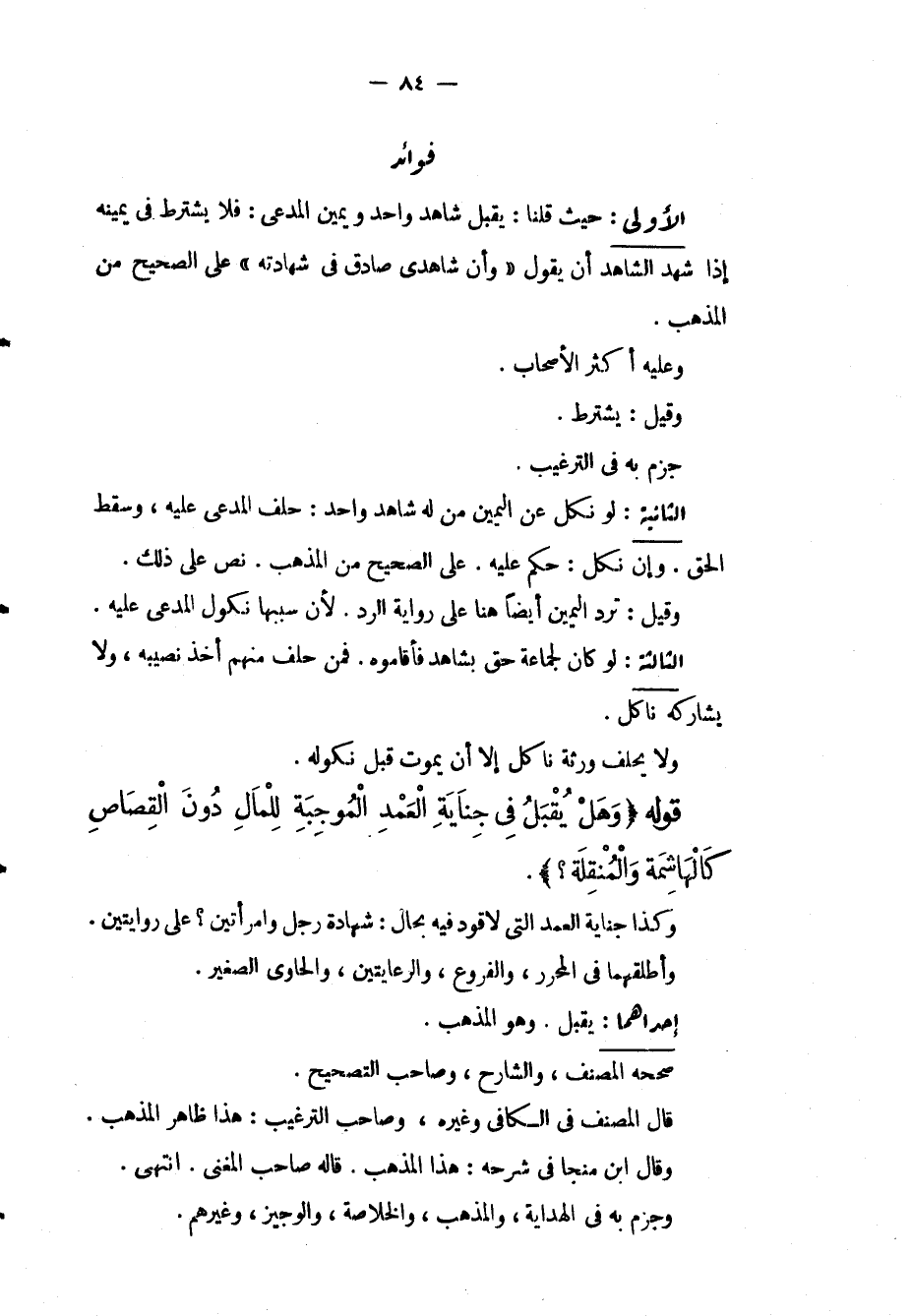 الثَّانِيَةُ: لَوْ نَكَلَ عَنْ الْيَمِينِ مَنْ لَهُ شَاهِدٌ وَاحِدٌ: حَلَفَ الْمُدَّعَى عَلَيْهِ، وَسَقَطَ الْحَقُّ إنْ نَكَلَ: حُكِمَ عَلَيْهِ، عَلَى الصَّحِيحِ مِنْ الْمَذْهَبِ، نَصَّ عَلَى ذَلِكَ، وَقِيلَ: تُرَدُّ الْيَمِينُ أَيْضًا هُنَا عَلَى رِوَايَةِ الرَّدِّ؛ لِأَنَّ سَبَبَهَا نُكُولُ الْمُدَّعَى عَلَيْهِ. الثَّالِثَةُ: لَوْ كَانَ لِجَمَاعَةٍ حَقٌّ بِشَاهِدٍ فَأَقَامُوهُ، فَمَنْ حَلَفَ مِنْهُمْ أَخَذَ نَصِيبَهُ، وَلَا يُشَارِكُهُ نَاكِلٌ، وَلَا يَحْلِفُ وَرَثَةُ نَاكِلٍ إلَّا أَنْ يَمُوتَ قَبْلَ نُكُولِهِ. قَوْلُهُ (وَهَلْ يُقْبَلُ فِي جِنَايَةِ الْعَمْدِ الْمُوجِبَةِ لِلْمَالِ دُونَ الْقِصَاصِ كَالْهَاشِمَةِ وَالْمُنَقِّلَةِ؟) وَكَذَا جِنَايَةُ الْعَمْدِ الَّتِي لَا قَوَدَ فِيهِ بِحَالٍ: شَهَادَةُ رَجُلٍ وَامْرَأَتَيْنِ؟ عَلَى رِوَايَتَيْنِ، وَأَطْلَقَهُمَا فِي الْمُحَرَّرِ، وَالْفُرُوعِ، وَالرِّعَايَتَيْنِ، وَالْحَاوِي الصَّغِيرِ. إحْدَاهُمَا: يُقْبَلُ، وَهُوَ الْمَذْهَبُ، صَحَّحَهُ الْمُصَنِّفُ، وَالشَّارِحُ، وَصَاحِبُ التَّصْحِيحِ، قَالَ الْمُصَنِّفُ فِي الْكَافِي وَغَيْرِهِ، وَصَاحِبُ التَّرْغِيبِ: هَذَا ظَاهِرُ الْمَذْهَبِ، وَقَالَ ابْنُ مُنَجَّا فِي شَرْحِهِ: هَذَا الْمَذْهَبُ، قَالَهُ صَاحِبُ الْمُغْنِي. انْتَهَى. وَجَزَمَ بِهِ فِي الْهِدَايَةِ، وَالْمُذْهَبِ، وَالْخُلَاصَةِ، وَالْوَجِيزِ، وَغَيْرِهِمْ،