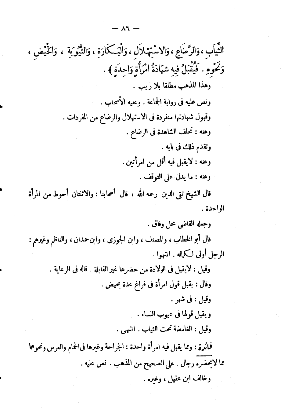 وَمِمَّا يُقْبَلُ فِيهِ امْرَأَةٌ وَاحِدَةٌ: الْجِرَاحَةُ وَغَيْرُهَا فِي الْحَمَّامِ وَالْعُرْسِ وَنَحْوِهِمَا مِمَّا لَا يَحْضُرُهُ رِجَالٌ عَلَى الصَّحِيحِ مِنْ الْمَذْهَبِ، نَصَّ عَلَيْهِ، وَخَالَفَ ابْنُ عَقِيلٍ، وَغَيْرُهُ.