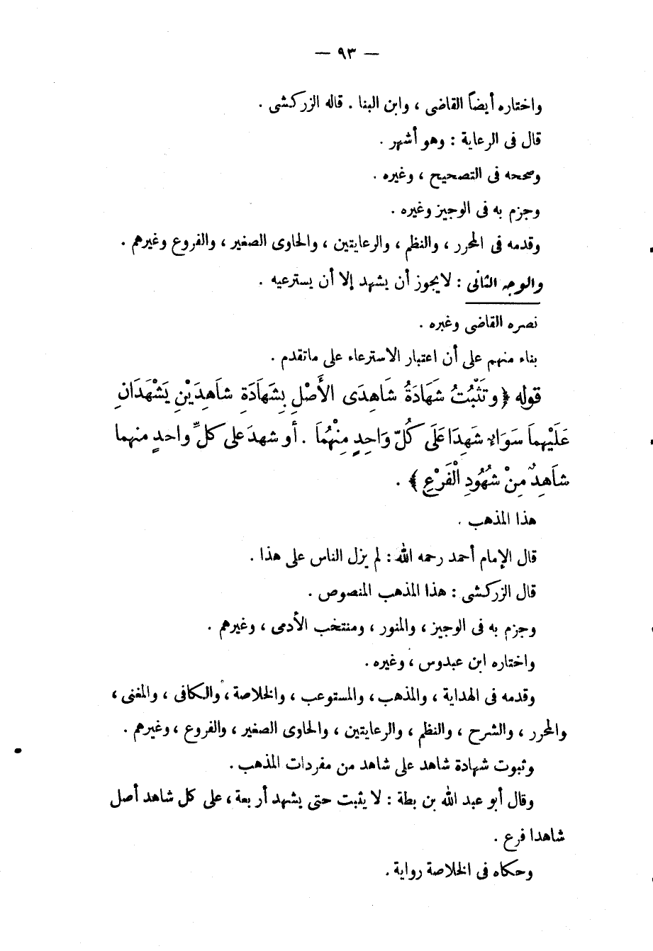 قَوْلُهُ (وَتَثْبُتُ شَهَادَةُ شَاهِدَيْ الْأَصْلِ بِشَهَادَةِ شَاهِدَيْنِ يَشْهَدَانِ عَلَيْهِمَا سَوَاءٌ شَهِدَا عَلَى كُلِّ وَاحِدٍ مِنْهُمَا، أَوْ شَهِدَ عَلَى كُلِّ وَاحِدٍ مِنْهُمَا شَاهِدٌ مِنْ شُهُودِ الْفَرْعِ) ، هَذَا الْمَذْهَبُ، قَالَ الْإِمَامُ أَحْمَدُ - رَحِمَهُ اللَّهُ -: لَمْ يَزَلْ النَّاسُ عَلَى هَذَا، قَالَ الزَّرْكَشِيُّ: هَذَا الْمَذْهَبُ الْمَنْصُوصُ، وَجَزَمَ بِهِ فِي الْوَجِيزِ، وَالْمُنَوِّرِ، وَمُنْتَخَبِ الْأَدَمِيِّ، وَغَيْرِهِمْ، وَاخْتَارَهُ ابْنُ عَبْدُوسٍ، وَغَيْرُهُ، وَقَدَّمَهُ فِي الْهِدَايَةِ، وَالْمُذْهَبِ، وَالْمُسْتَوْعِبِ، وَالْخُلَاصَةِ، وَالْكَافِي، وَالْمُغْنِي، وَالْمُحَرَّرِ، وَالشَّرْحِ، وَالنَّظْمِ، وَالرِّعَايَتَيْنِ، وَالْحَاوِي الصَّغِيرِ، وَالْفُرُوعِ، وَغَيْرِهِمْ، وَثُبُوتُ شَهَادَةِ شَاهِدٍ عَلَى شَاهِدٍ مِنْ مُفْرَدَاتِ الْمَذْهَبِ، وَقَالَ أَبُو عَبْدِ اللَّهِ بْنُ بَطَّةَ: لَا يَثْبُتُ حَتَّى يَشْهَدَ أَرْبَعَةٌ، عَلَى كُلِّ شَاهِدِ أَصْلٍ شَاهِدَا فَرْعٍ، وَحَكَاهُ فِي الْخُلَاصَةِ رِوَايَةٌ.