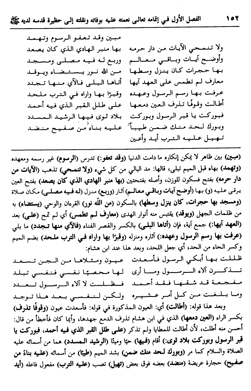 "مبين" بَيّن ظاهر لا يمكن إنكاره ما دامت الدنيا, "وقد تعفو" تدرس الرسوم غير رسمه ومعهده, و"تهمد" بهاء قبل الميم- تبلى، قالها: مَدّ البالي من كل شيء, "ولا تنمحي" تذهب الآيات من دار حرمه بفتح فسكون للوزن، وأصله -بفتحتين- "بها منبر الهادي الذي كان يصعد" بفتح العين يرقى عليه" وبها "أوضح آيات وباقي معالم" آثار, "وربع" منزل "له فيه مصلى" مكان صلاة, "ومسجد بها حجرات، كان ينزل وسطها" بالسكون "من الله نور" القرآن والوحي, "يستضاء" به من ظلمات الجهل, "ويوقد" يقتبس منه أنوار الهدى "معارف لم تطمس" أي: لم تمح "على" بعد "العهد آيها" جمع آية، فإن "أتاها البلى" بالكسر والقصر- الفناء, "فالآي منها تجدّد" ما بلي, "عرفت بها رسم الرسول وعهده" آثاره ومنزله, "وقبرًا بها واراه في الترب ملحد" بضم الميم وكسر الحاء- من الحد، أي: جعل اللحد، وبعد هذا عند ابن هشام: