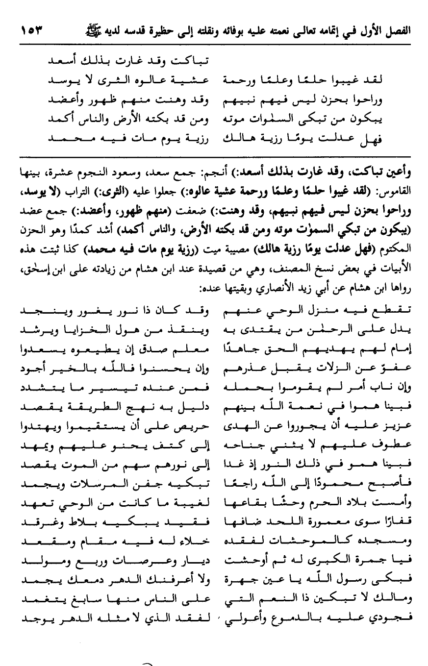 وأعين تباكت، وقد غارت بذلك أسعد" أنجم, جمع سعد، وسعود النجوم عشرة، بينها القاموس: "لقد غيبوا حلمًا وعلمًا ورحمة عشية عالوه" جعلوا عليه "الثرى" التراب, "لا يوسّد" وراحوا بحزن ليس فيهم نبيهم، وقد وهنت" ضعفت "منهم ظهور وأعضد" جمع عضد, "يبكون من تبكي السموات موته, ومن قد بكته الأرض والناس أكمد" أشد كمدًا وهو الحزن المكتوم, "فهل عدلت يومًا رزية هالك" مصيبة ميت, "رزية يوم مات فيه محمد" كذا ثبتت هذه الأبيات في بعض نسخ المصنف، وهي من قصيدة عند ابن هشام, من زيادته على ابن إسحاق، رواها ابن هشام عن أبي زيد الأنصاري وبقيتها عنده: