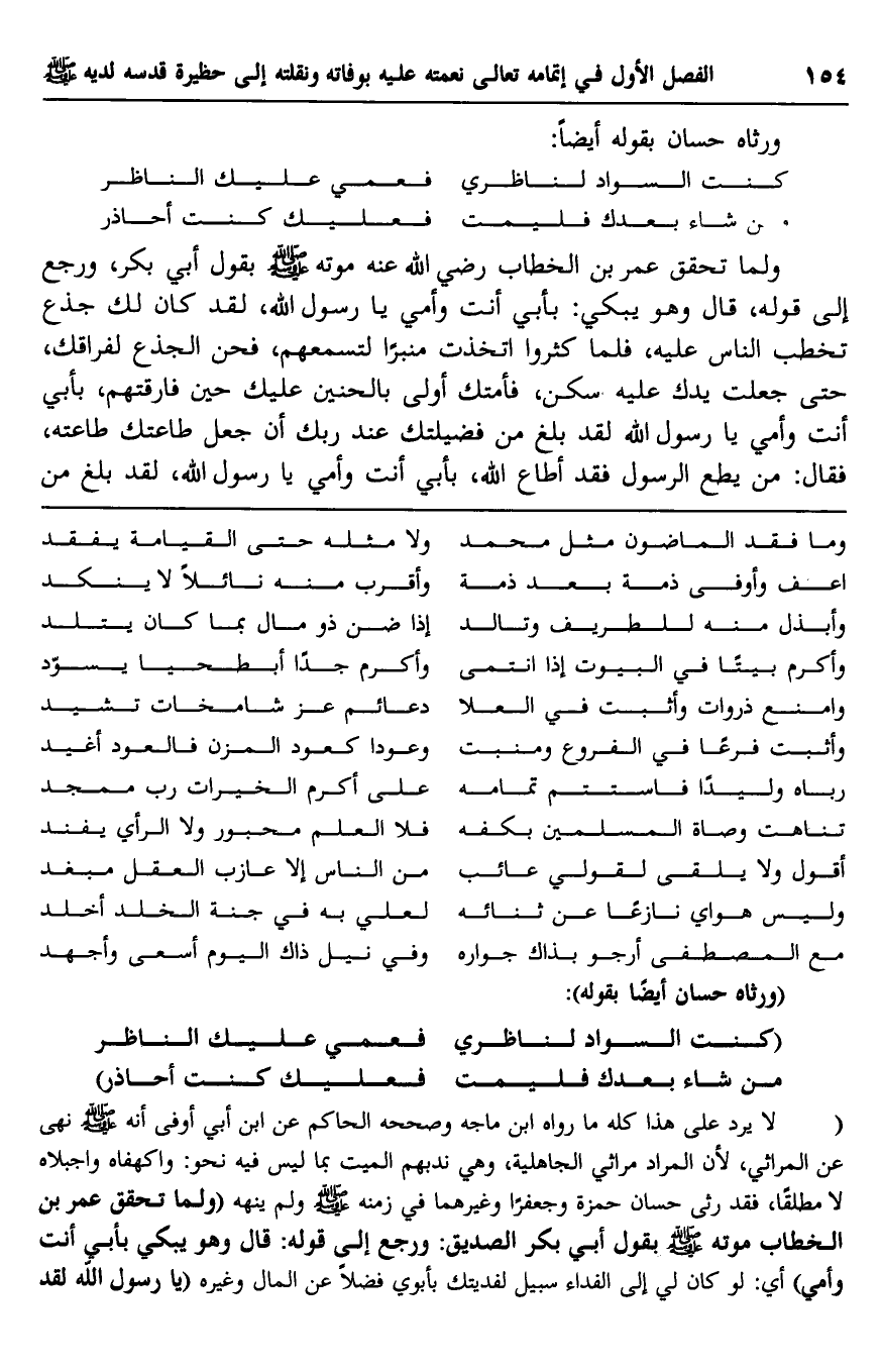 "لا يرد على هذا كله ما رواه ابن ماجه وصحَّحه الحاكم عن ابن أبي أوفى أنه -صلى الله عليه وسلم- نهى عن المراثي؛ لأنَّ المراد مراثي الجاهلية، وهي ندبهم الميت بما ليس فيه نحو: واكهفاه واجبلاه لا مطلقًا، فقد رثى حسان حمزة وجعفرًا وغيرهما في زمنه -صلى الله عليه وسلم- ولم ينهه, "ولما تحقق عمر بن الخطاب موته -صلى الله عليه وسلم- بقول أبي بكر الصديق: ورجع إلى قوله: قال: وهو يبكي بأبي أنت وأمي" أي: لو كان لي إلى الفداء سبيل لفديتك بأبوي, فضلًا عن المال وغيره "يا رسول الله لقد