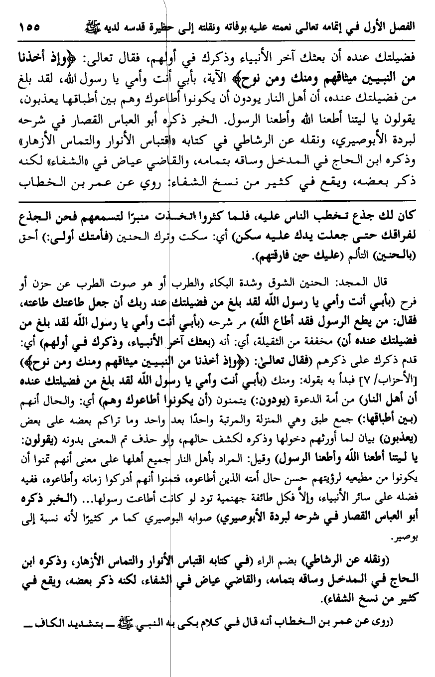 فضيلتك عنده أن بعثك آخر الأنبياء وذكرك في أولهم، فقال تعالى: {وَإِذْ أَخَذْنَا مِنَ النَّبِيِّينَ مِيثَاقَهُمْ وَمِنْكَ وَمِنْ نُوحٍ} الآية، بأبي أنت وأمي يا رسول الله، لقد بلغ من فضيلتك عنده، أنَّ أهل النار يودون أن يكونوا أطاعوك وهم بين أطباقها يعذّبون، يقولون: {يَا لَيْتَنَا أَطَعْنَا اللَّهَ وَأَطَعْنَا الرَّسُولا} . الخبر ذكره أبو العباس القصَّار في شرحه لبردة الأبو صيري، ونقله عن الرشاطي في كتابه: "اقتباس الأنوار والتماس الأزهار", وذكره ابن الحاجّ في المدخل وساقه بتمامه، والقاضي عياض في "الشفاء", لكنه ذكره بعضه، ويقع في كثير من نسخ الشفاء: روي عن عمر بن الخطاب