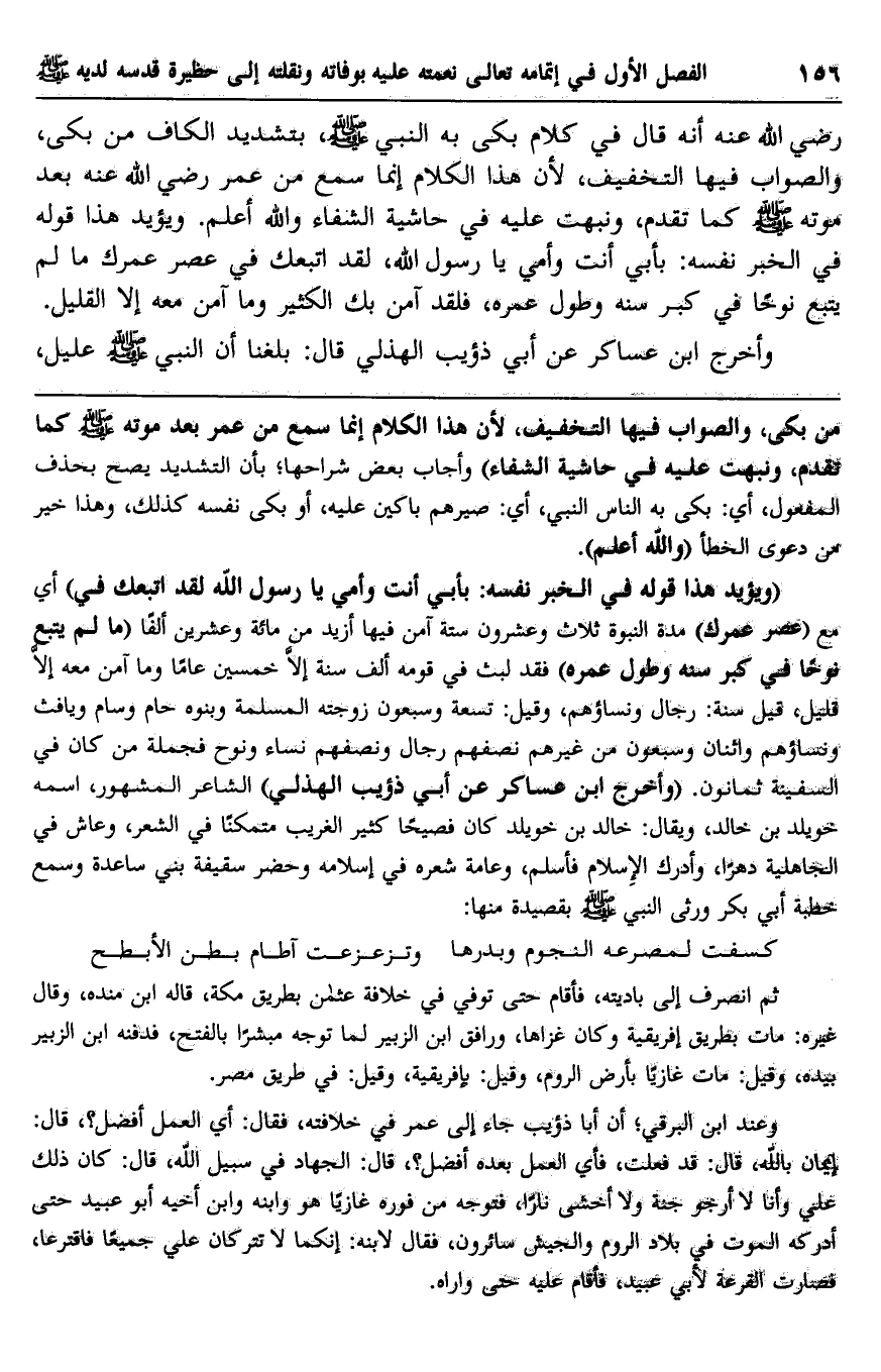 رضي الله عنه- أنه قال في كلام بكَّى به النبيُّ -صلى الله عليه وسلم -بتشديد الكاف من بَكَى، والصواب فيها التخفيف؛ لأن هذا الكلام إنما سمع من عمر بعد موته -صلى الله عليه وسلم- كما تقدم، ونبهت عليه في حاشية الشفاء", والله أعلم. ويؤيد هذا قوله في الخبر نفسه: بأبي أنت وأمي يا رسول الله, لقد اتبعك في عصر عمرك ما لم يتبع نوحًا في كبر سنة وطول عمره, فلقد آمن بك الكثير وما آمن معه إلا القليل. وأخرج ابن عساكر عن أبي ذؤيب الهذلي قال: بلغنا أن النبي -صلى الله عليه وسلم- عليل،