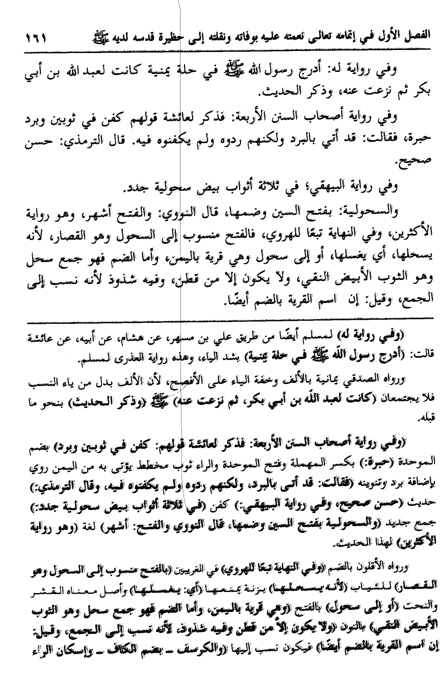 "وفي رواية أصحاب السنن الأربعة: فذكر لعائشة قولهم: كفّن في ثوبين وبرد" بضم الموحدة, "حبرة" بكسرة المهملة وفتح الموحدة والراء- ثوب مخطّط يؤتى به من اليمن, روي بإضافة برد وتنوينه, "فقالت: قد أتي بالبرد، ولكنّهم ردوه ولم يكفنوه فيه، وقال الترمذي:" حديث "حسن صحيح، وفي رواية البيهقي:" كفن "في ثلاثة أثواب بيض سحولية جدد" جمع جديد, "والسحولية -بفتح السين وضمها، قال النووي: والفتح أشهر" لغة, "وهو رواية الأكثرين" لهذا الحديث.