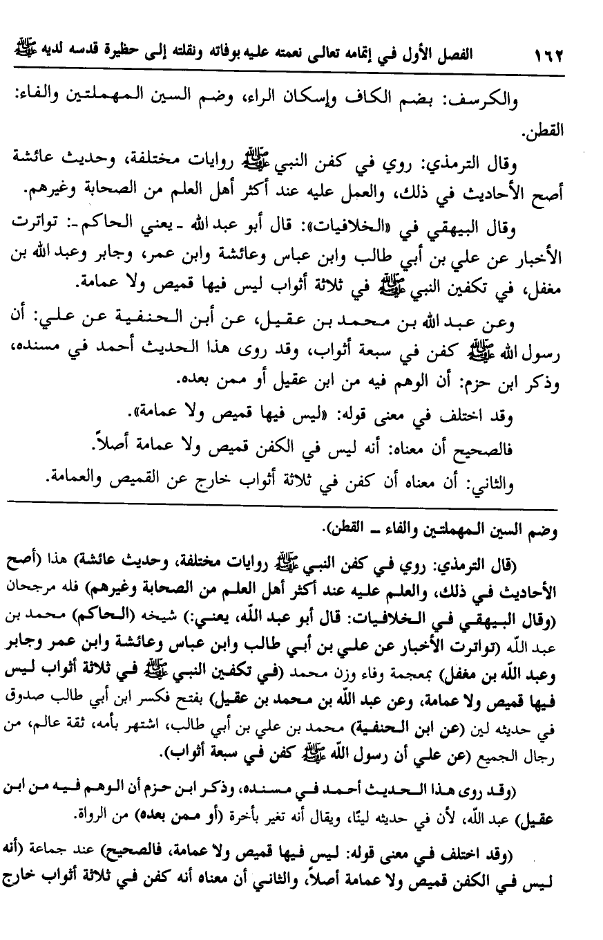 وقال البيهقي في "الخلافيات": قال أبو عبد الله -يعني الحاكم: تواترت الأخبار عن علي بن أبي طالب وابن عباس وعائشة وابن عمر، وجابر وعبد الله بن مغفل، في تكفين النبي -صلى الله عليه وسلم- في ثلاثة أثواب ليس فيها قميص ولا عمامة.