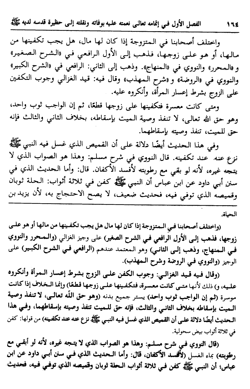 وفي هذا الحديث أيضًا دلالة على أنَّ القميص الذي غسل فيه النبي -صلى الله عليه وسلم- نزع عنه عند تكفينه. قال النووي في شرح مسلم: وهذا هو الصواب الذي لا يتجه غيره؛ لأنه لو بقي مع رطوبته لأفسد الأكفان. قال: وأمَّا الحديث الذي في سنن أبي داود عن ابن عباس أن النبي -صلى الله عليه وسلم- كفن في ثلاثة أثواب: الحلة ثوبان, وقميصه الذي توفي فيه، فحديث ضعيف، لا يصح الاحتجاج به؛ لأن يزيد بن