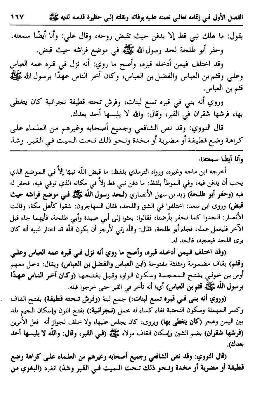 "وروي أنه بني في قبره تسع لبنات" جمع لبنة, "وفرش تحته قطيفة" بفتح القاف وكسر المهملة وسكون التحتية ففاء- كساء له خمل, "نجرانية" بفتح النون وإسكان الجيم- بلد بين اليمن وهجر, "كان يتغطَّى بها", ويروى: كان يجلس عليها، ولاخلف لجواز أنه فعل الأمرين, "فرشها شقران" بضم الشين وإسكان القاف- مولاه -صلى الله عليه وسلم- في القبر، وقال: والله لا يلبسها أحد بعدك.