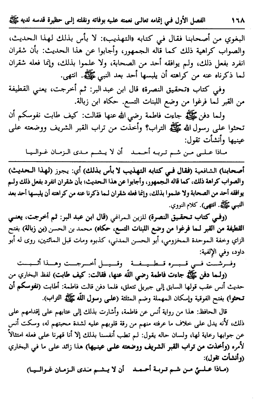 "وفي كتاب تحقيق النصرة" للزين المراغي, "قال ابن عبد البر: ثم أخرجت -يعني: القطيفة- من القبر, لما فرغوا من وضع اللبنات التسع، حكاه" محمد بن الحسن "بن زبالة" بفتح الزاي وخفة الموحدة- المخزومي، أبو الحسن المدني، كذَّبوه, ومات قبل المائتين، روى له أبو داود، وفي الألفية: