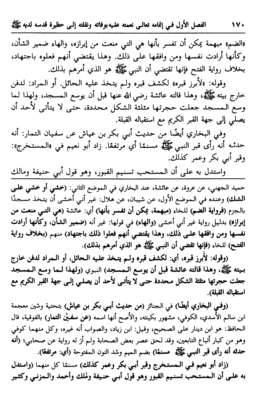 وفي البخاري أيضًا من حديث أبي بكر بن عياش عن سفيان التمار: إنه حدثه أنه رأى قبر النبي -صلى الله عليه وسلم- مسنمًا, أي: مرتفعًا. زاد أبو نعيم في "المستخرج": وقبر أبي بكر وعمر كذلك.