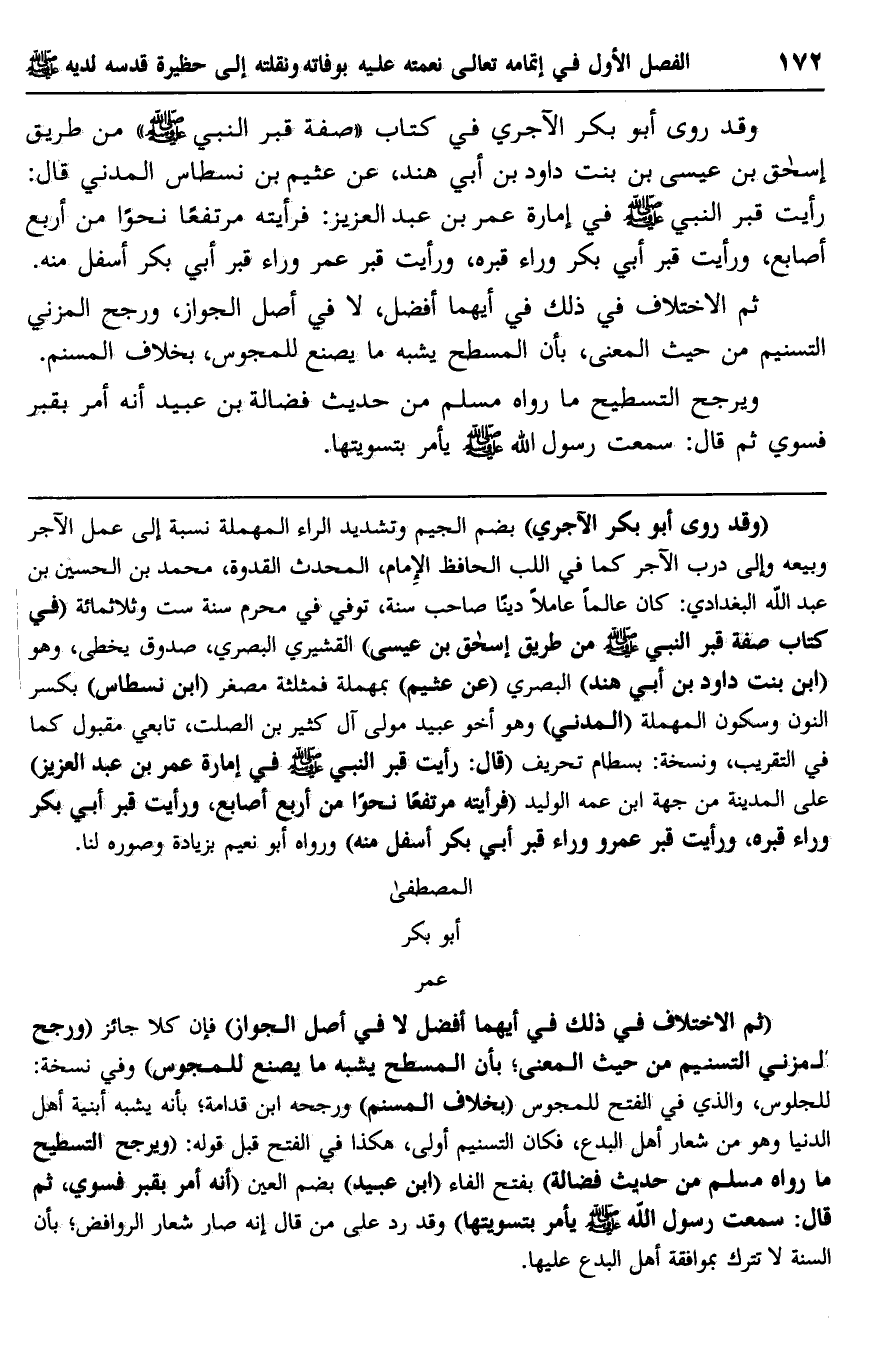 وقد روى أبو بكر الآجري" بضم الجيم وتشديد الراء المهملة- نسبة إلى عمل الآجر وبيعه, وإلى درب الآجر كما في اللب الحافظ الإمام، المحدث القدوة، محمد بن الحسين بن عبد الله البغدادي, كان عالمًا عاملًا دينًا صاحب سنة، توفي في محرم سنة ست وثلاثمائة, في كتاب صفة قبر النبي -صلى الله عليه وسلم- من طريق "إسحاق بن عيسى" القشيري البصري، صدوق يخطى، وهو "ابن بنت داود بن أبي هند" البصري "عن عثيم" بمهملة فمثلثة مصغر, "ابن نسطاس" بكسر النون المهملة "المدني", وهوأخو عبيد مولى آل كثير بن الصلت، تابعي مقبول كما في التقريب، ونسخة بسطام تحريف "قال: رأيت قبر النبي -صلى الله عليه وسلم- في إمارة عمر بن عبد العزيز" على المدينة من جهة ابن عمه الوليد, "فرأيته مرتفعًا نحوًا من أربع أصابع، ورأيت قبر أبي بكر" وراء قبره، ورأيت قبر عمر وراء قبر أبي بكر أسفل منه", ورواه أبو نعيم بزيادة وصورة لنا.