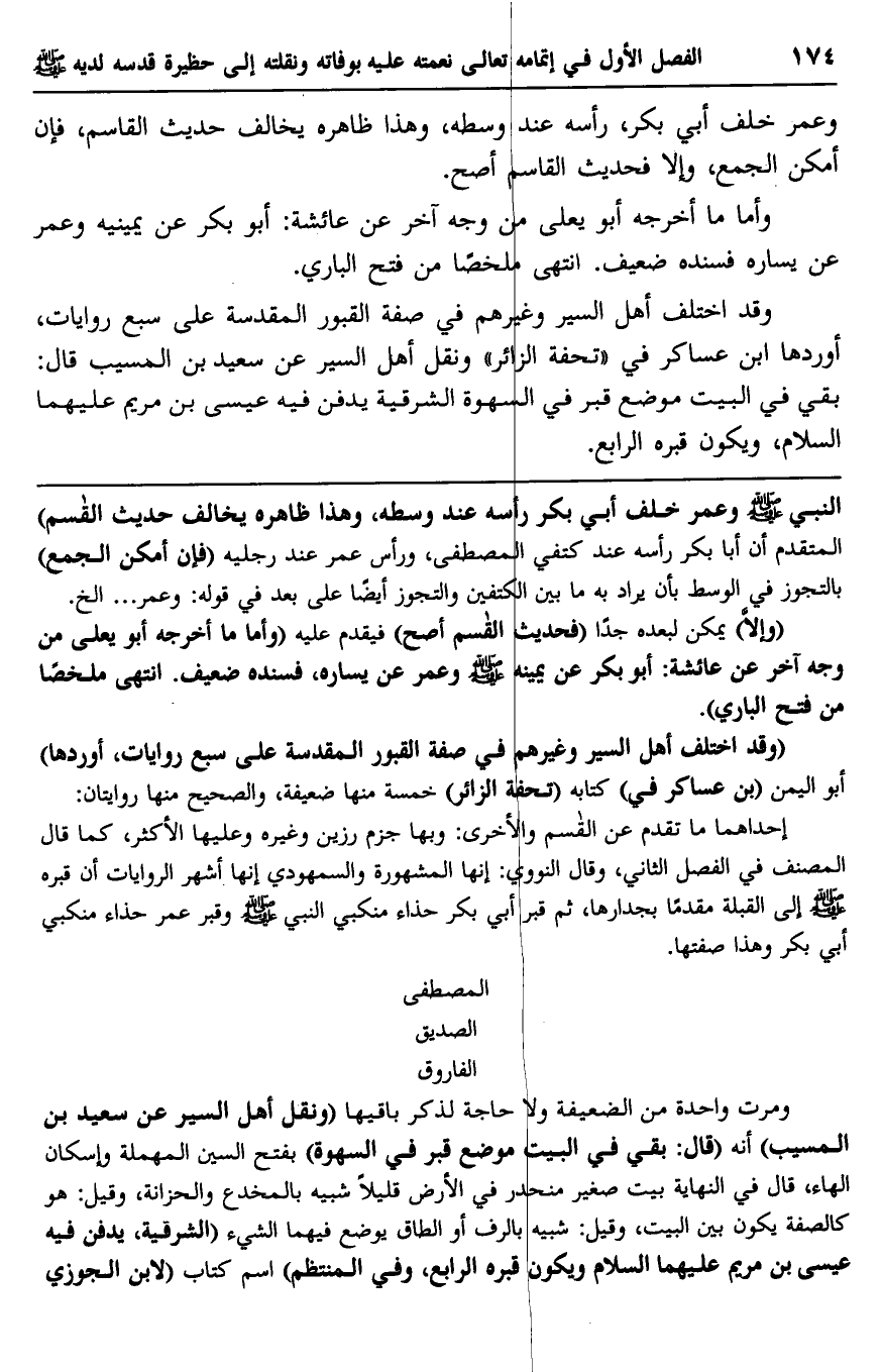 "وقد اختلف أهل السير وغيرهم في صفة القبور المقدّسة على سبع روايات، أوردها أبو اليمن "بن عساكر في" كتابه "تحفة الزائر" خمسة منها ضعيفة، والصحيح منها روايتان.
