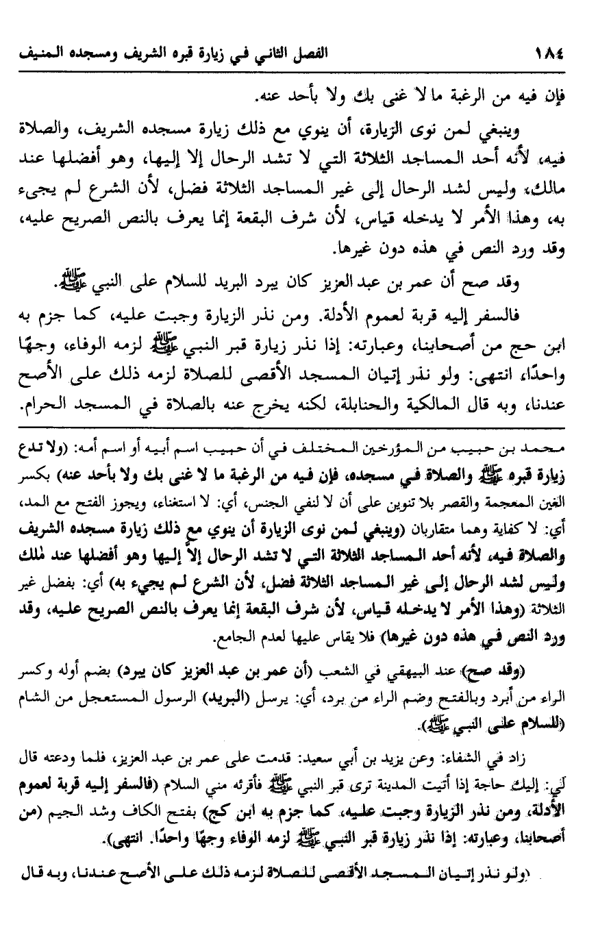 محمد بن حبيب, من المؤرخين المختلف في أنَّ حبيب اسم أبيه أو اسم أمه, "ولا تدع زيارة قبره -صلى الله عليه وسلم- والصلاة في مسجده، فإن فيه من الرغبة ما لا غنى بك ولا بأحد عنه" بكسر الغين المعجمة والقصر بلا تنوين- على أن لا لنفي الجنس، أي: لا استغناء، ويجوز الفتح مع المد، أي: لا كفاية, وهما متقاربان, "وينبغي لمن نوى الزيارة أن ينوي مع ذلك زيارة مسجده الشريف والصلاة فيه؛ لأنه أحد المساجد الثلاثة التي لا تشد الرحال إلا إليها, وهو أفضلها عند مالك وليس لشد الرحال إلى غير المساجد الثلاثة فضل؛ لأنَّ الشرع لم يجئ به" أي: بفضل غير الثلاثة, "وهذا الأمر لا يدخله قياس؛ لأن شرف البقعة إنما يعرف بالنص الصريح عليه، وقد ورد النص في هذه دون غيرها" فلا يقاس عليها لعدم الجامع.