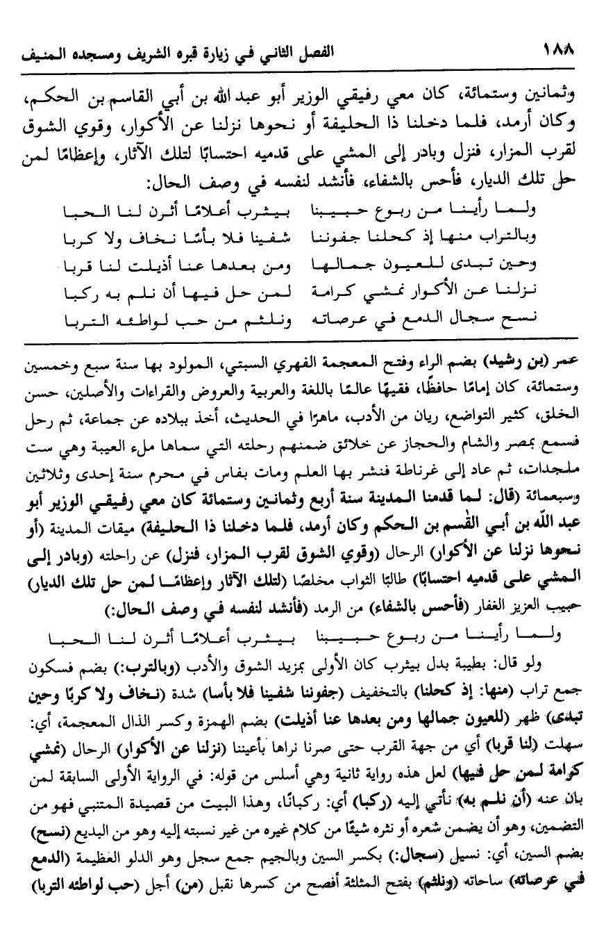 عمر "بن رشيد" بضمّ الراء وفتح المعجمة- الفهري السبتي، المولود بها سنة سبع وخمسين وستمائة، كان إمامًا حافظًا، فقيهًا عالمًا باللغة والعربية والعروض والقراءات والأصلين، حسن الخلق، كثير التواضع، ريّان من الأدب، ماهرًا في الحديث، أخذ ببلاده عن جماعة، ثم رحل فسمع بمصر والشام والحجاز عن خلائف ضمنهم رحلته التي سماها: ملء العيبة, وهي ست ملجدات، ثم عاد إلى غرناطة, فنشر بها العلم, ومات بفاس في محرَّم سنة إحدى وثلاثين وسبعمائة, "قال: لما قدمنا المدينة سنة أربع وثمانين وستمائة, كان معي رفيقي الوزير أبو عبد الله بن أبي القاسم بن الحكم, وكان أرمد، فلمَّا دخلنا ذا الحليفة" ميقات المدينة "أو نحوها, نزلنا عن الأكوار" الرحال, "وقوي الشوق لقرب المزار، فنزل" عن راحلته وبادر إلى المشي على قدميه احتسابًا" طالبًا الثواب مخلصًا "لتلك الآثار, وإعظامًا لمن حلّ تلك الديار" حبيب العزيز الغفار, "فأحسَّ بالشفاء" من الرمد, "فأنشد لنفسه في وصف الحال"