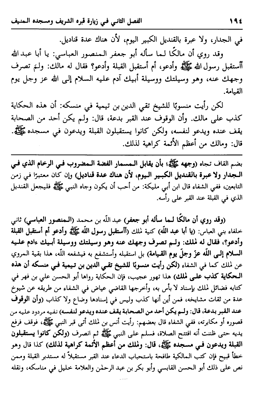 "وقد روي أن مالكًا لما سأله أبو جعفر" عبد الله بن محمد "المنصور العباسي" ثاني خلفاء بني العباء: "يا أبا عبد الله" كنية مالك, "أأستقبل رسول الله -صلى الله عليه وسلم- وأدعو, أم أستقبل القبلة وأدعو؟ فقال له مالك: ولم تصرف وجهك عنه وهو وسيلتك, ووسيلة أبيك أدم -عليه السلام- إلى الله -عز وجل- يوم القيامة، بل استقبله واستشْفِع به فيشفعه الله، هذا بقية المروي عن مالك -كما في الشفاء, "لكن رأيت منسوبًا للشيخ تقي الدين بن تيمية في منسكه, أنَّ هذه الحكاية كذب على مال" هذا تهوّر عجيب، فإن الحكاية رواها أبو الحسن علي بن فهر في كتابه: فضائل مالك, بإسنادٍ لا بأس به، وأخرجها القاضي عياض في الشفاء من طريقه, عن شيوخ عدة من ثقات مشايخه، فمن أين أنها كذب, وليس في إسنادها وضَّاع ولا كذَّاب, "وأنَّ الوقوف عند القبر بدعة، قال: ولم يكن أحد من الصحابة يقف عنده ويدعو لنفسه" نفيه مردود عليه من قصوره أو مكابرته، ففي الشفاء قال بعضهم: رأيت أنس بن مالك أتى قبر النبي -صلى الله عليه وسلم، فوقف فرفع يديه, حتى ظننت أنه افتتح الصلاة, فسلَّم على النبي -صلى الله عليه وسلم- ثم انصرف, "ولكن كانوا يستقبلون القبلة ويدعون في مسجده -صلى الله عليه وسلم, قال: ومالك من أعظم الأئمة كراهيةً لذلك" كذا قال, وهو خطأ قبيح, فإن كتب المالكية طافحة باستحباب الدعاء عند القبر مستقبلًا له مستدبر القبلة, ومِمَّنْ نَصَّ على ذلك أبو الحسن القابسي, وأبو بكر بن عبد الرحمن, والعلامة خليل في مناسكه، ونقله