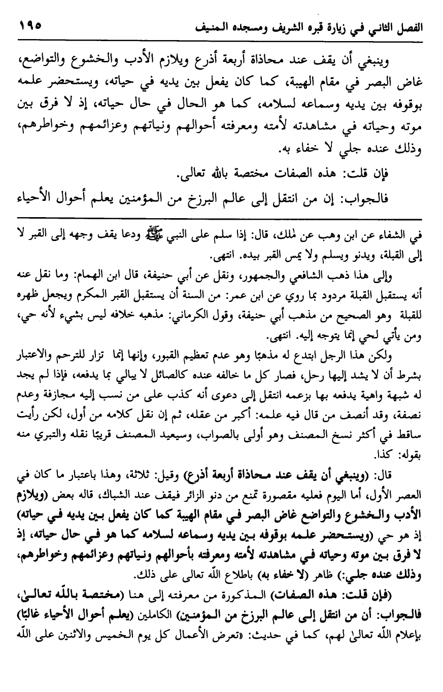 قال: وينبغي أن يقف عند محاذاة أربع أذرع" وقيل: ثلاثة، وهذا باعتبار ما كان في العصر الأوّل، أمَّا اليوم فعليه مقصورة تمنع من دنو الزائر, فيق عند الشباك، قاله بعض, "ويلازم الأدب والخشوع والتواضع, غاضّ البصر في مقام الهيبة, كما كان يفعل بين يديه في حياته"؛ إذ هو حي, "ويستحضر علمه بوقوفه بين يديه, وسماعه لسلامه, كما هو في حال حياته؛ إذ لا فرق بين موته وحياته في مشاهدته لأمته, ومعرفته بأحوالهم ونياتهم وعزائمهم وخواطرهم، وذلك عنده جليّ" ظاهر "لا خفاء به" باطِّلاع الله تعالى على ذلك.