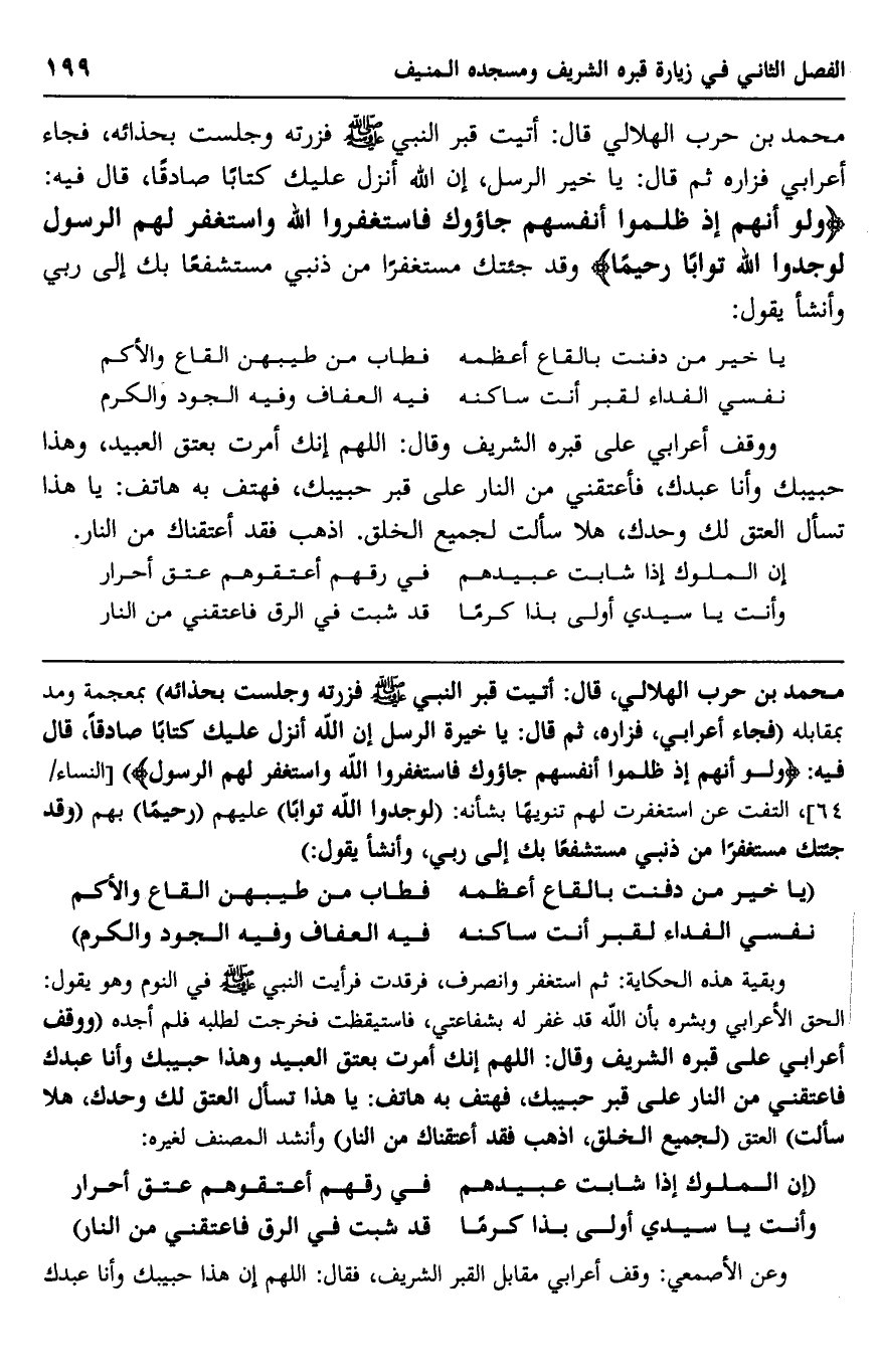 محمد بن حرب الهلالي قال: أتيت قبر النبي -صلى الله عليه وسلم- فزرته, وجلست بحذائه، فجاء أعرابي فزاره ثم قال: يا خير الرسل، إن الله أنزل عليك كتابًا صادقًا، قال فيه: {وَلَوْ أَنَّهُمْ إِذْ ظَلَمُوا أَنْفُسَهُمْ جَاءُوكَ فَاسْتَغْفَرُوا اللَّهَ وَاسْتَغْفَرَ لَهُمُ الرَّسُولُ لَوَجَدُوا اللَّهَ تَوَّابًا رَحِيمًا} وقد جئتك مستغفرًا من ذنبي مستشفعًا بك إلى ربي, وأنشأ يقول: