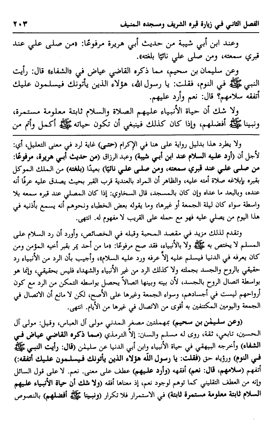 وتقدم لذلك مزيد في مقصد المحبة وقبله في الخصائص، وأورد أن ردَّ السلام على المسلِّم لا يختص به -صلى الله عليه وسلم, ولا بالأنبياء، فقد صحَّ مرفوعًا: "ما من أحد يمر بقبر أخيه المؤمن, ومن كان يعرفه في الدنيا فيسلِّم عليه, إلا عرفه وردَّ عليه السلام"، وأجيب بأنَّ الرد من الأنبياء رد حقيقي بالروح والجسد بجملته, ولا كذلك الرد من غير الأنبياء والشهداء فليس بحقيقي، وإنما هو بواسطة اتصال الروح بالجسد، لأنَّ بينه وبينها اتصالًا يحصل بواسطة التمكّن من الرد, كون أرواحهم ليست في أجسادهم, وسواء الجمعة وغيرها على الأصح، لكن لا مانع أنَّ الاتصال في الجمعة واليومين المكتنفين به أقوى من الاتصال في غيرها من الأيام. انتهى.