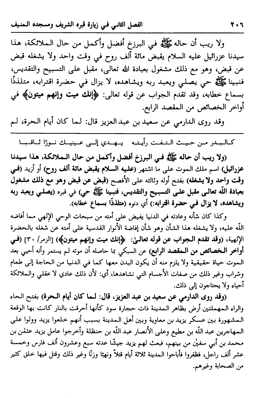 ولا ريب أن حاله -صلى الله عليه وسلم- في البرزخ أفضل وأكمل من حال الملائكة، هذا سيدنا عزرائيل -عليه السلام- يقبض مائة ألف روح في وقت واحد, ولا يشغله قبض عن قبض، وهو مع ذلك مشغول بعبادة الله تعالى، مقبل على التسبيح والتقديس، فنبينا -صلى الله عليه وسلم- حي يصلي ويعبد ربه ويشاهده، لا يزال في حضرة اقترابه، متلذذًا بسماع خطابه، وقد تقدَّم الجواب عن قوله تعالى: {إِنَّكَ مَيِّتٌ وَإِنَّهُمْ مَيِّتُونَ} في أواخر الخصائص من المقصد الرابع.