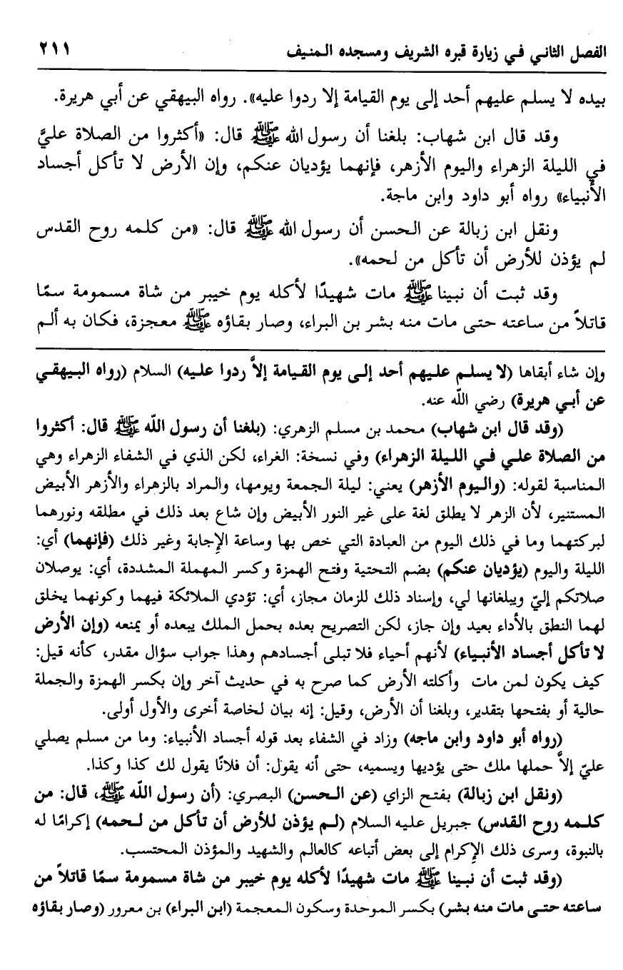 وقد قال ابن شهاب: بلغنا أن رسول الله -صلى الله عليه وسلم- قال: "أكثروا من الصلاة علي في الليلة الزهراء واليوم الأزهر، فإنهما يؤديان عنكم، وإن الأرض لا تأكل أجساد الأنبياء" رواه أبو داود وابن ماجه.