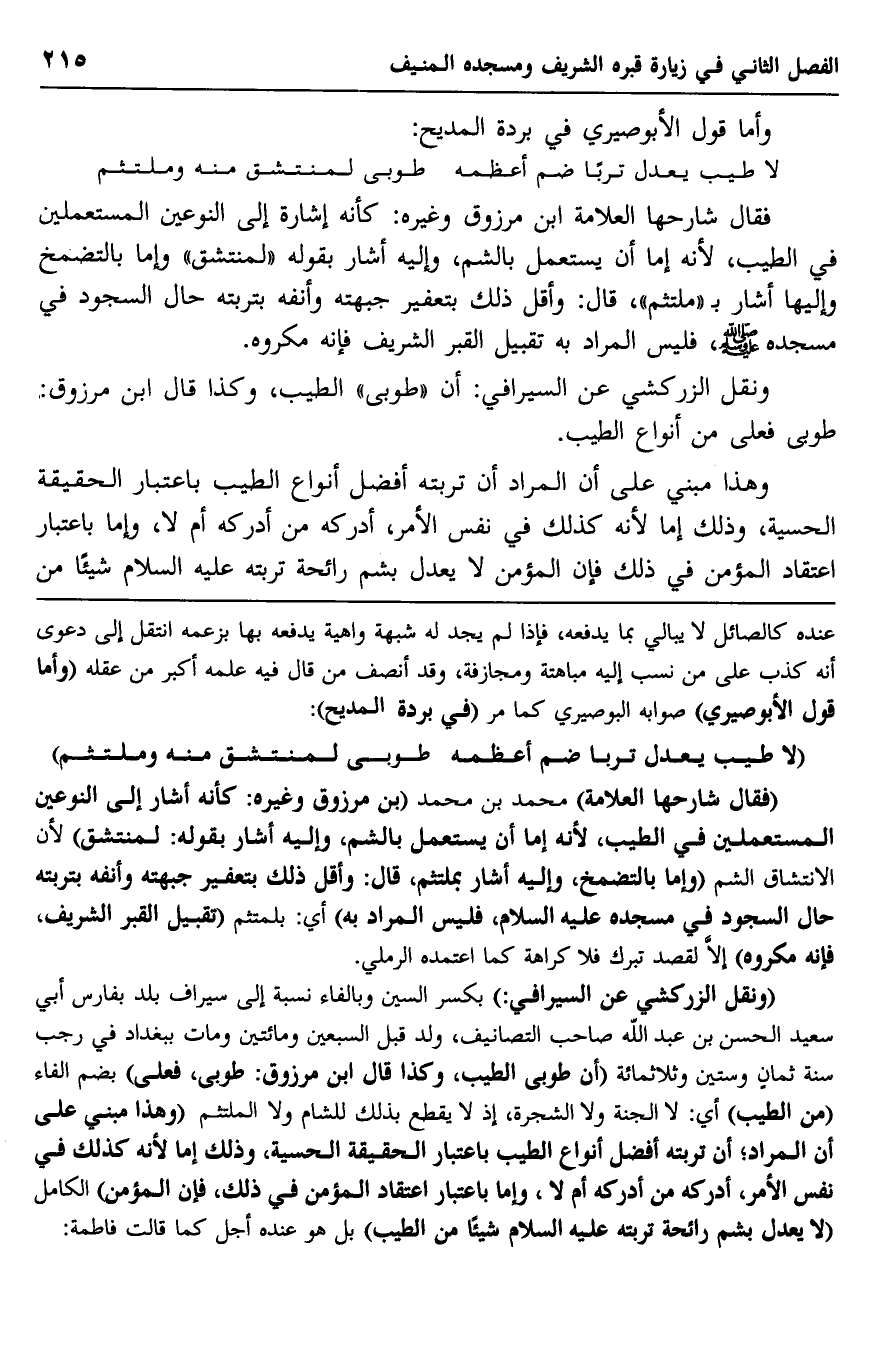 "ونقل الزركشي عن السيرافي:" بكسر السين وبالفاء- نسبة إلى سيراف, بلد بفارس, أبي سعيد الحسن بن عبد الله, صاحب التصانيف، ولد قبل السبعين ومائتين, ومات ببغداد في رجب سنة ثمان وستين وثلاثمائة, "أن طوبى الطيب، وكذا قال ابن مرزوق: طوبى فعلى" بضم الفاء "من الطيب" أي: لا الجنة والشجرة؛ إذ لا يقطع بذلك للشام ولا الملتثم, "وهذا مبني على أن المراد أن تربته أفضل أنواع الطيب باعتبار الحقيقة الحسية، وذلك إمَّا لأنه كذلك في نفس الأمر، أدركه من أدركه أم لا، وإمَّا باعتبار اعتقاد المؤمن في ذلك، فإن المؤمن الكامل لا يعدل بشمّ رائحة تربته -عليه السلام- من الطيب" بل هو عنده أجلّ كما قالت فاطمة: